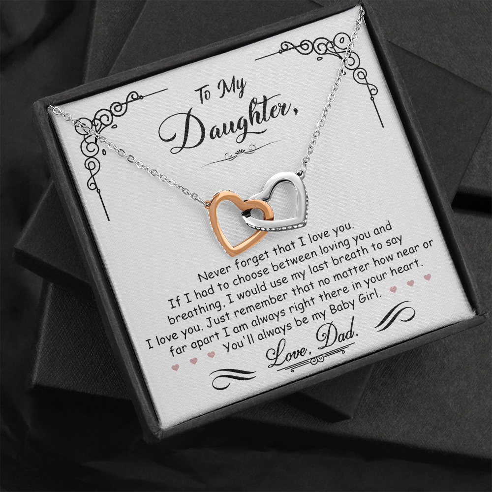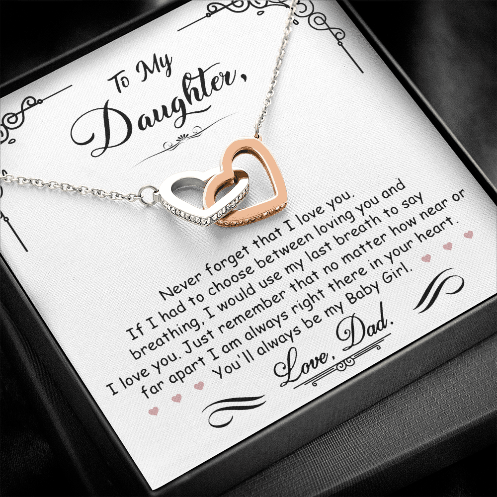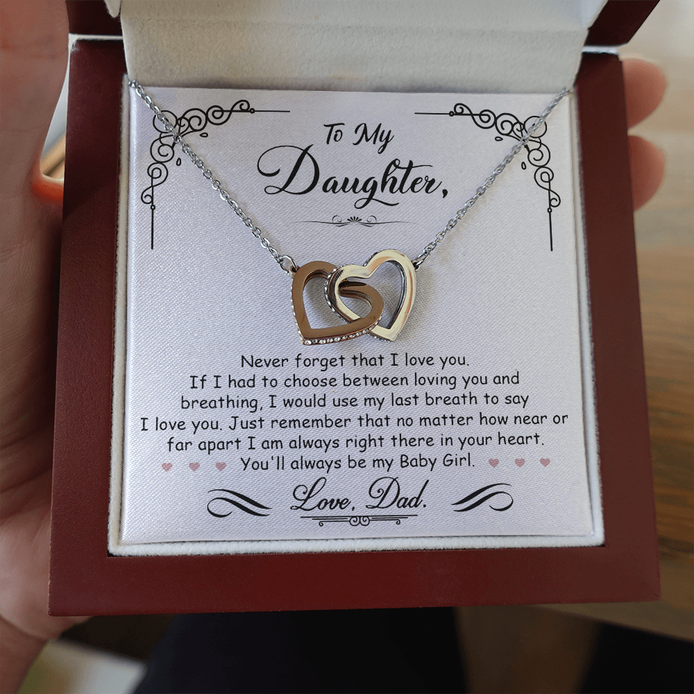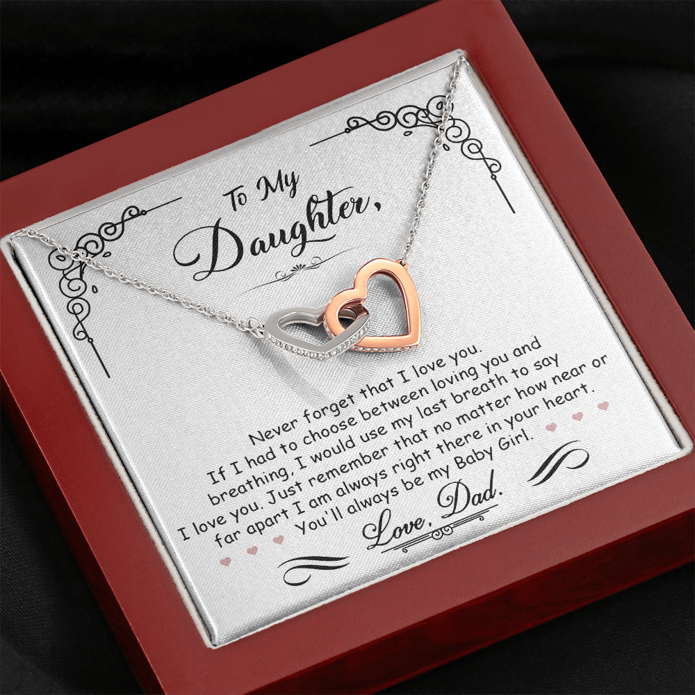Two hearts embellished with Cubic Zirconia stones, interlocked together as a symbol of never-ending love. Made with high quality polished surgical steel. Cable chain measures 18 inches with a 4 inch extension, and fastens with a lobster clasp.