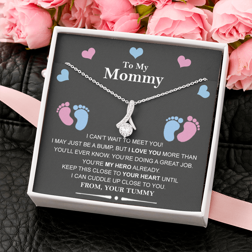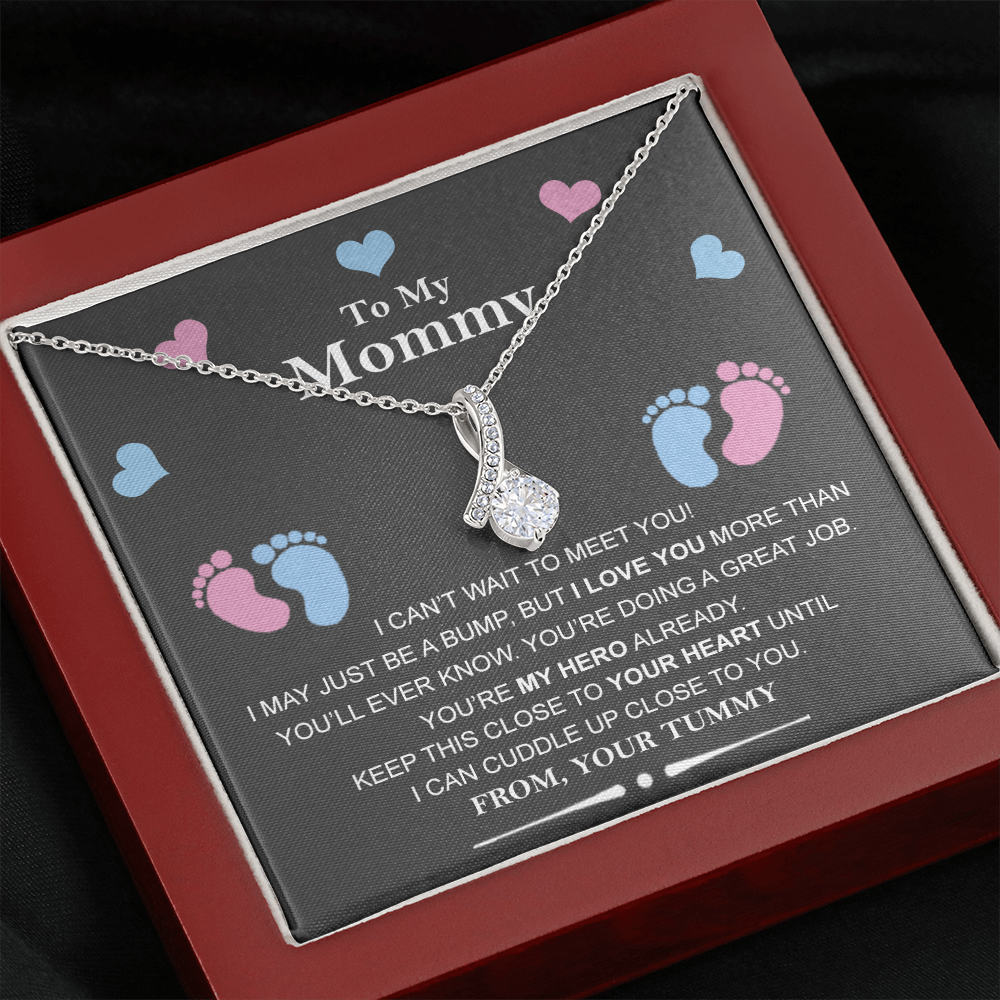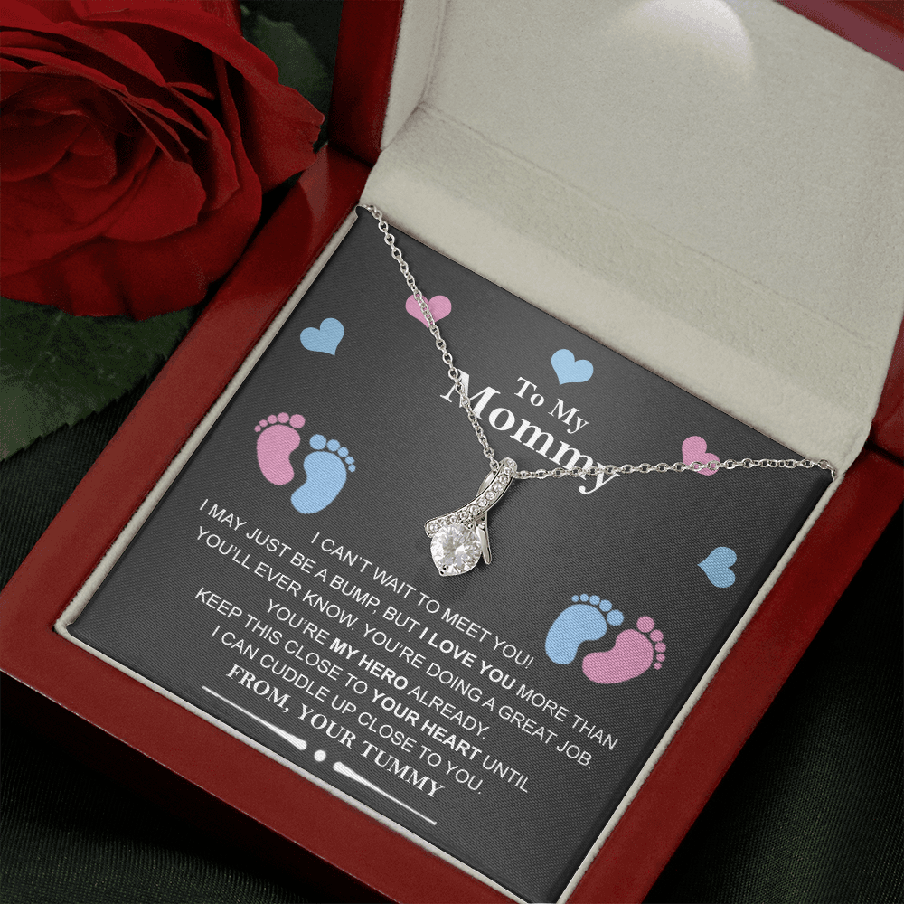 This beautiful sparkly pendant is truly is an alluring gift for yourself or a loved one. The ribbon design is embellished with dainty cubic zirconia, leading your eye down to the 7mm round cut Cubic Zirconia. Crafted with 14k White Gold over Stainless Steel, this necklace dresses up any occasion. The adjustable oblate cable chain allows the necklace to be worn at 18" to 22" in length. Product Dimensions: Height: 0.8" (20mm) x Width: 0.4" (10mm) 7mm cubic zirconia 18"-22" adjustable oblate cable chain with lobster clasp.