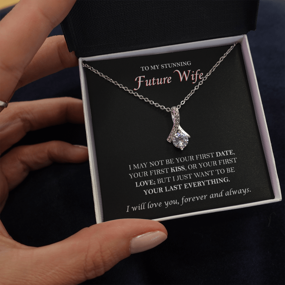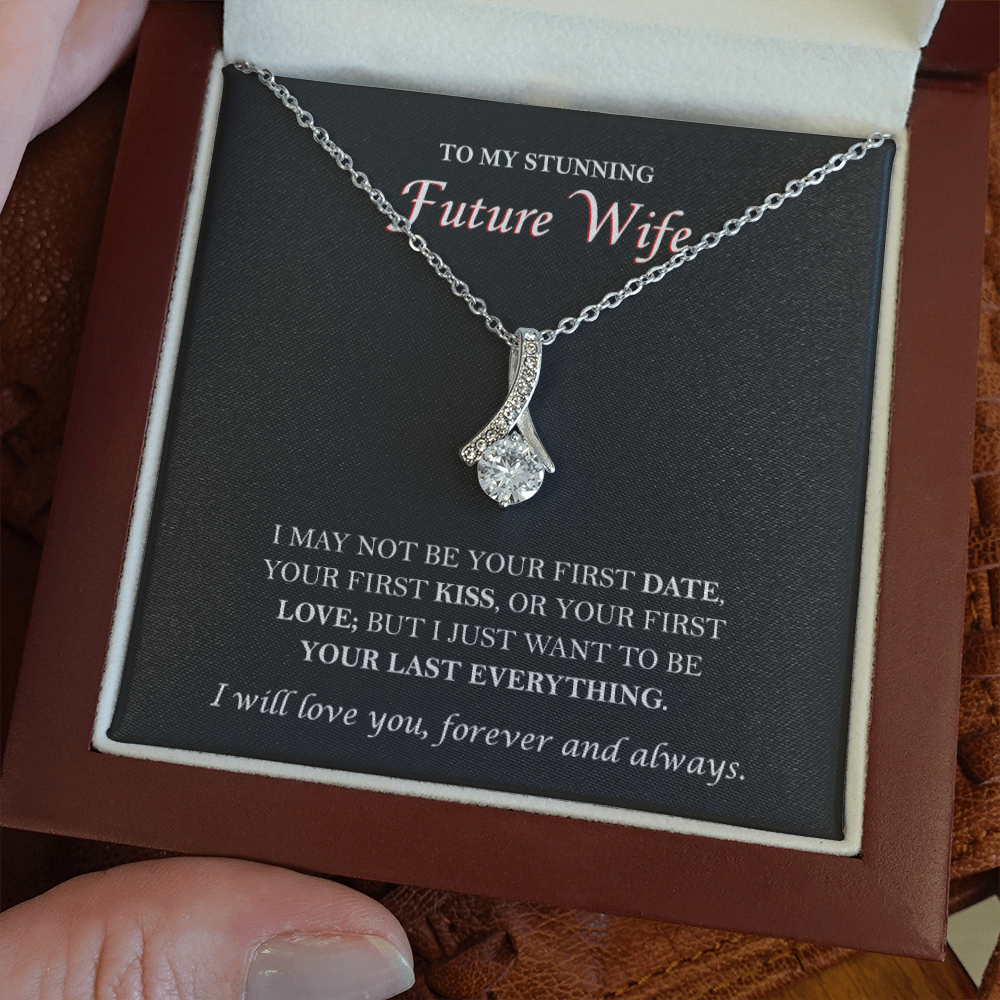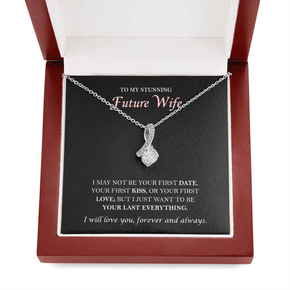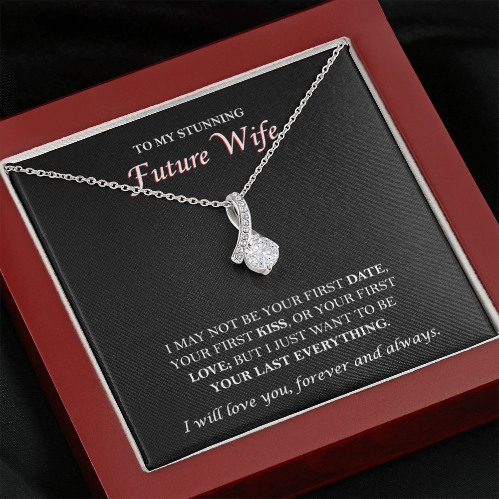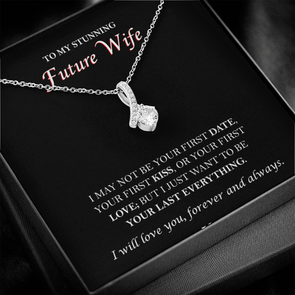 This beautiful sparkly pendant is truly is an alluring gift for yourself or a loved one. The ribbon design is embellished with dainty cubic zirconia, leading your eye down to the 7mm round cut Cubic Zirconia. Crafted with 14k White Gold over Stainless Steel, this necklace dresses up any occasion. The adjustable oblate cable chain allows the necklace to be worn at 18" to 22" in length. Product Dimensions: Height: 0.8" (20mm) x Width: 0.4" (10mm) 7mm cubic zirconia 18"-22" adjustable oblate cable chain with lobster clasp.