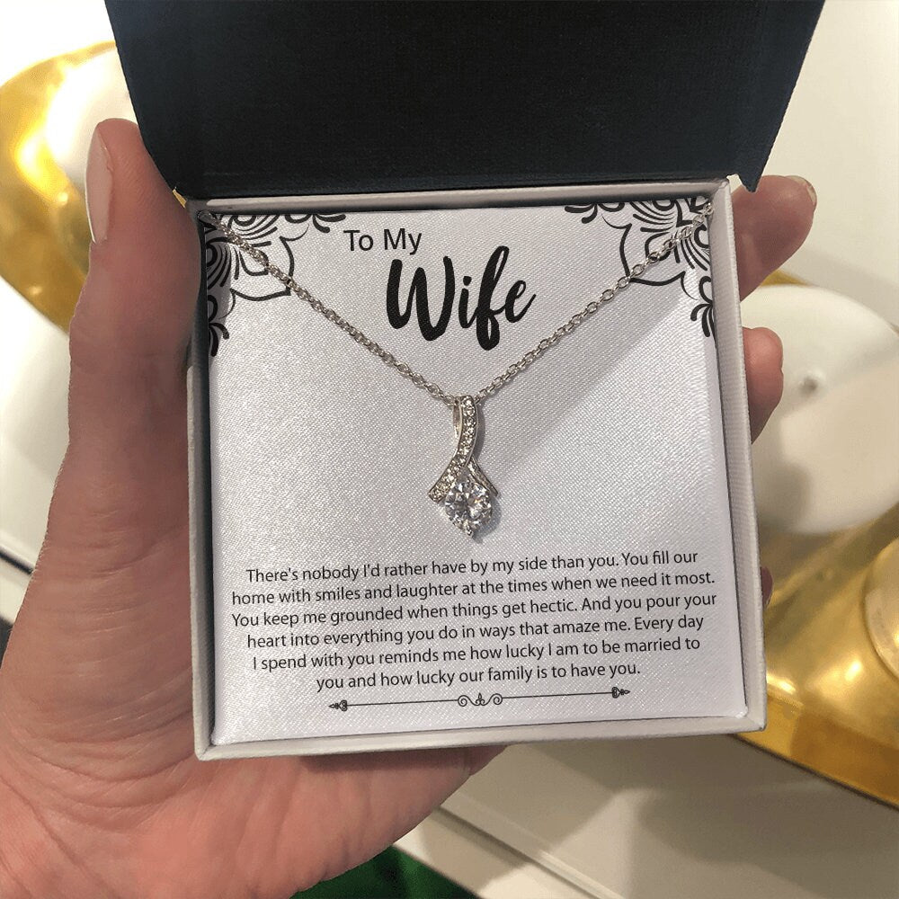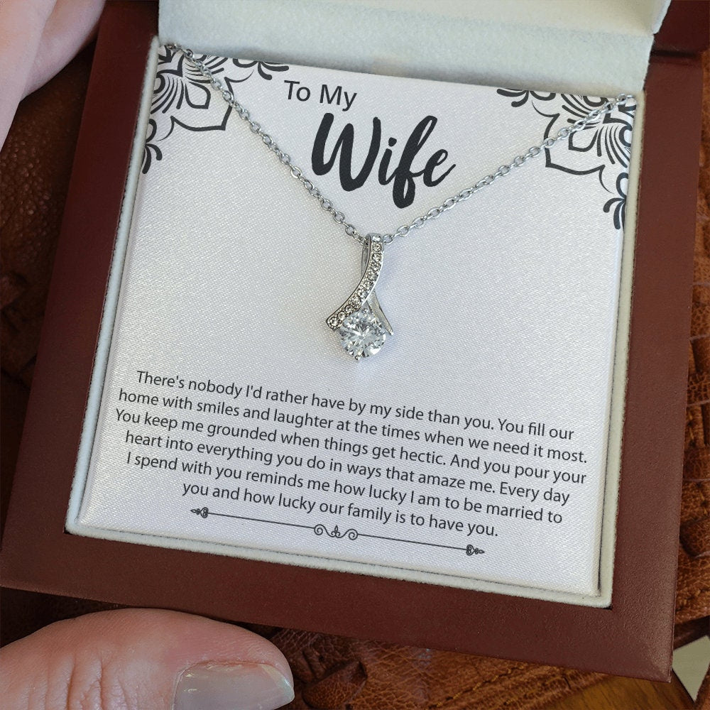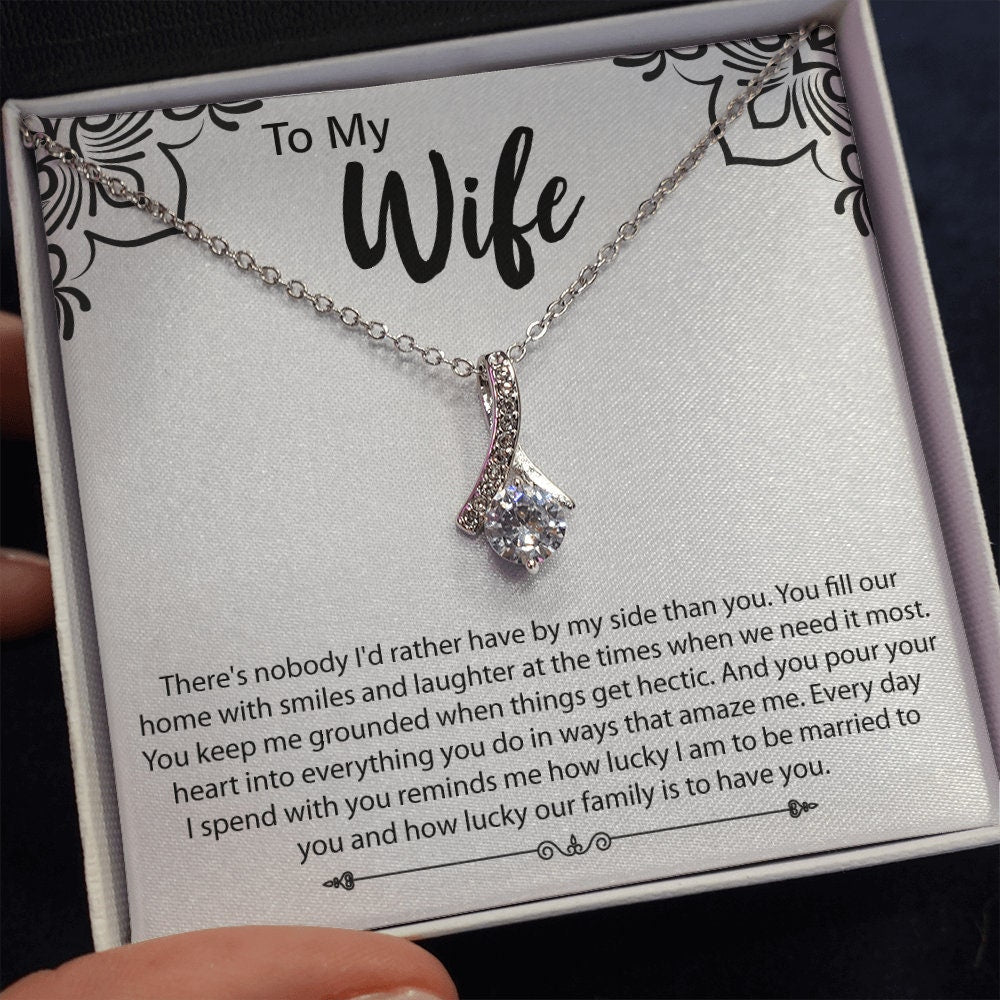 The words on this says it all. Get her something special that she will treasure forever. This beautiful sparkly pendant is truly is an alluring gift for yourself or a loved one. The ribbon design is embellished with dainty cubic zirconia, leading your eye down to the 7mm round cut Cubic Zirconia. Crafted with 14k White Gold over Stainless Steel, this necklace dresses up any occasion. The adjustable oblate cable chain allows the necklace to be worn at 18" to 22" in length. Product Dimensions: Height: 0.8" (20mm) x Width: 0.4" (10mm) 7mm cubic zirconia 18"-22" adjustable oblate cable chain with lobster clasp.