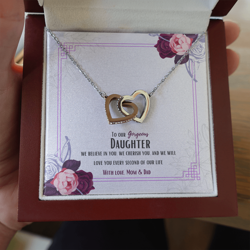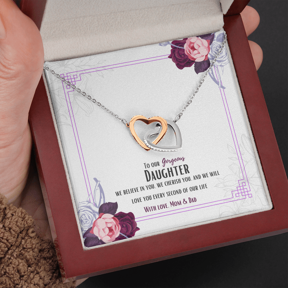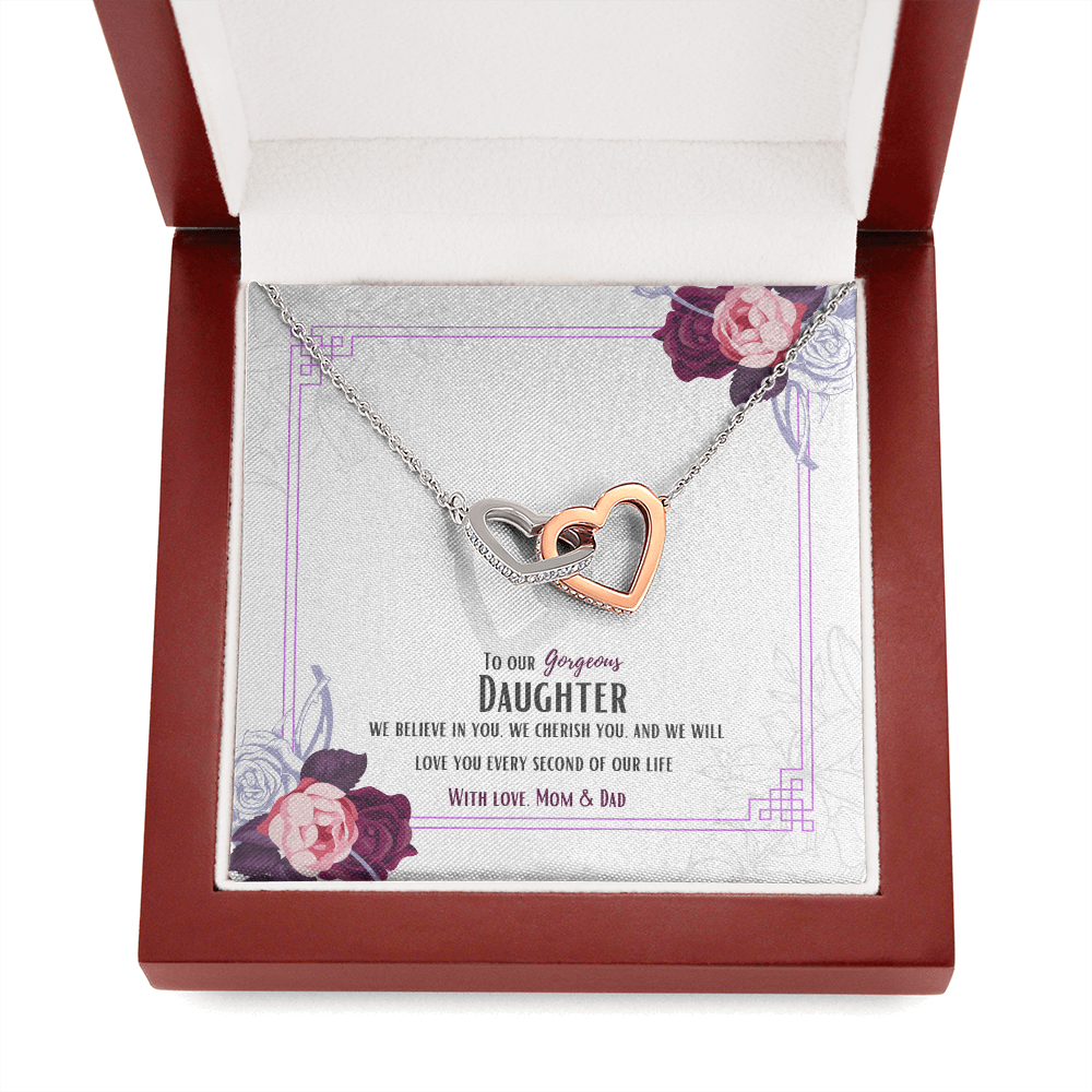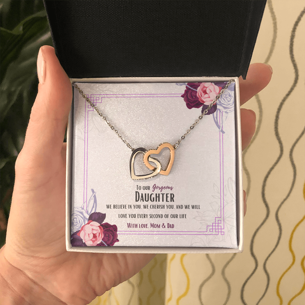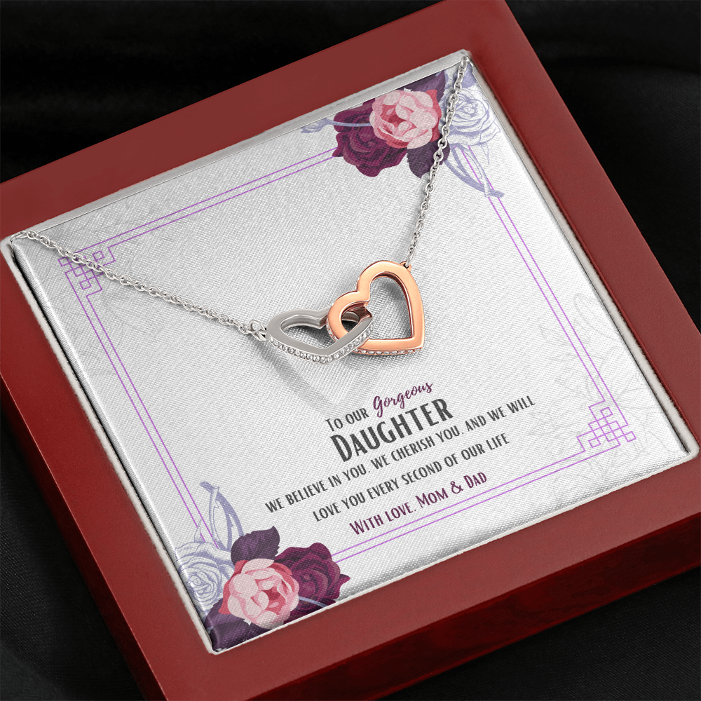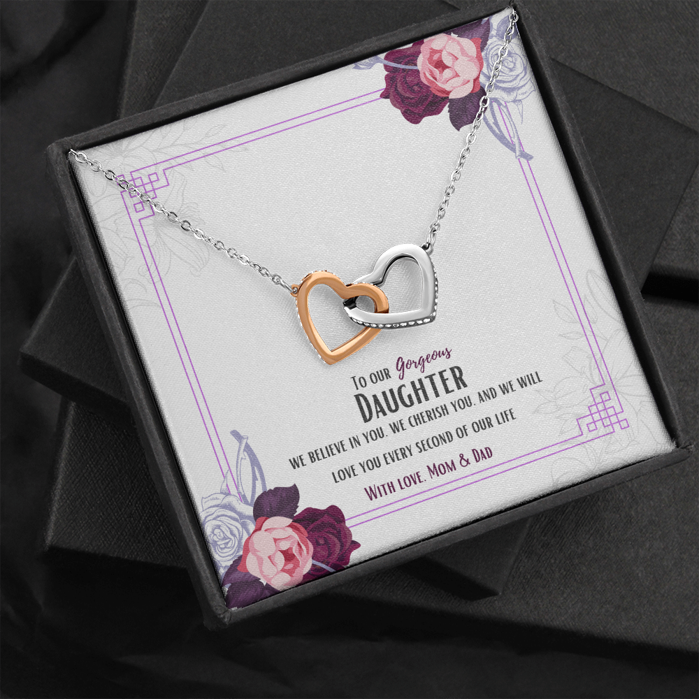 Two hearts embellished with Cubic Zirconia stones, interlocked together as a symbol of never-ending love. Made with high quality polished surgical steel. Cable chain measures 18 inches with a 4 inch extension, and fastens with a lobster clasp.
