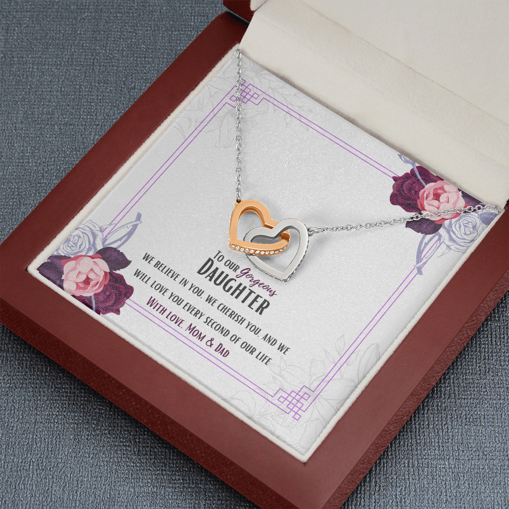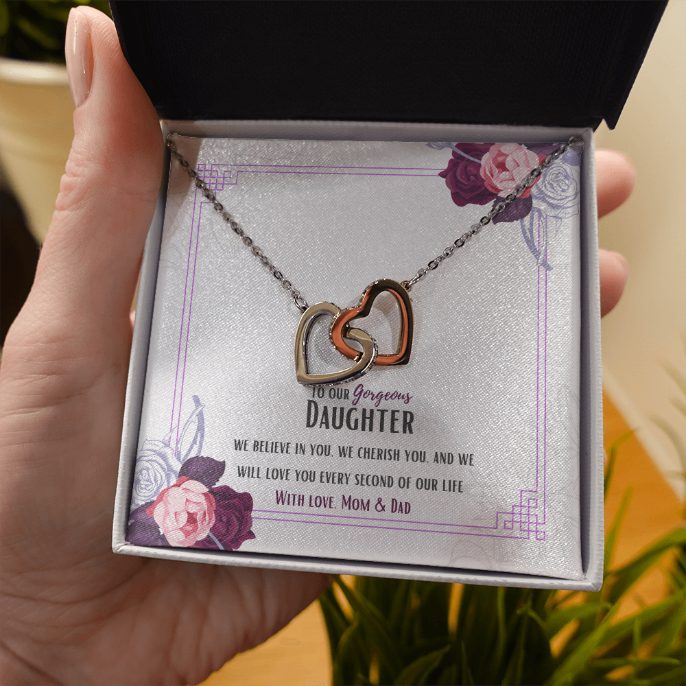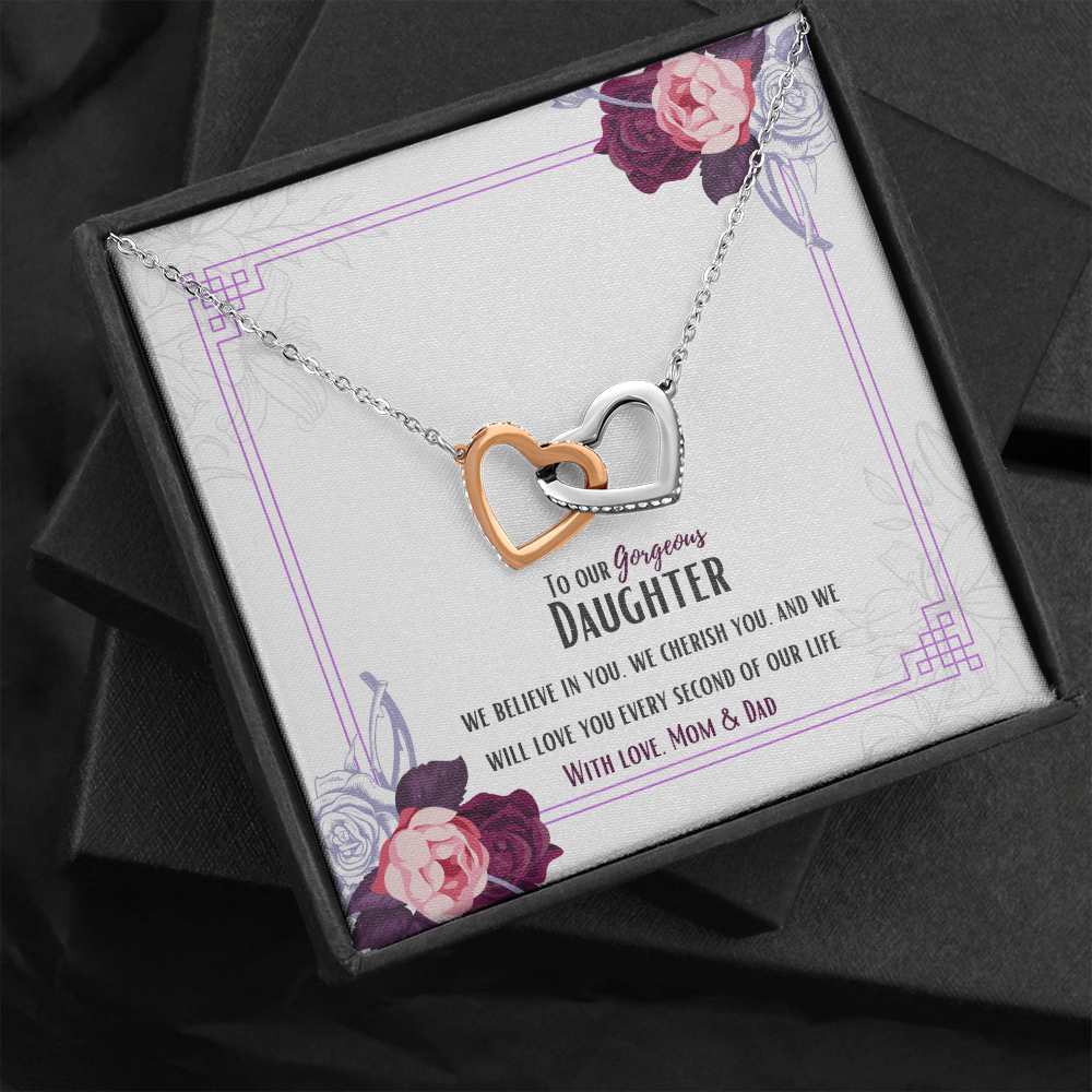 Two hearts embellished with Cubic Zirconia stones, interlocked together as a symbol of never-ending love. Made with high quality polished surgical steel. Cable chain measures 18 inches with a 4 inch extension, and fastens with a lobster clasp.
