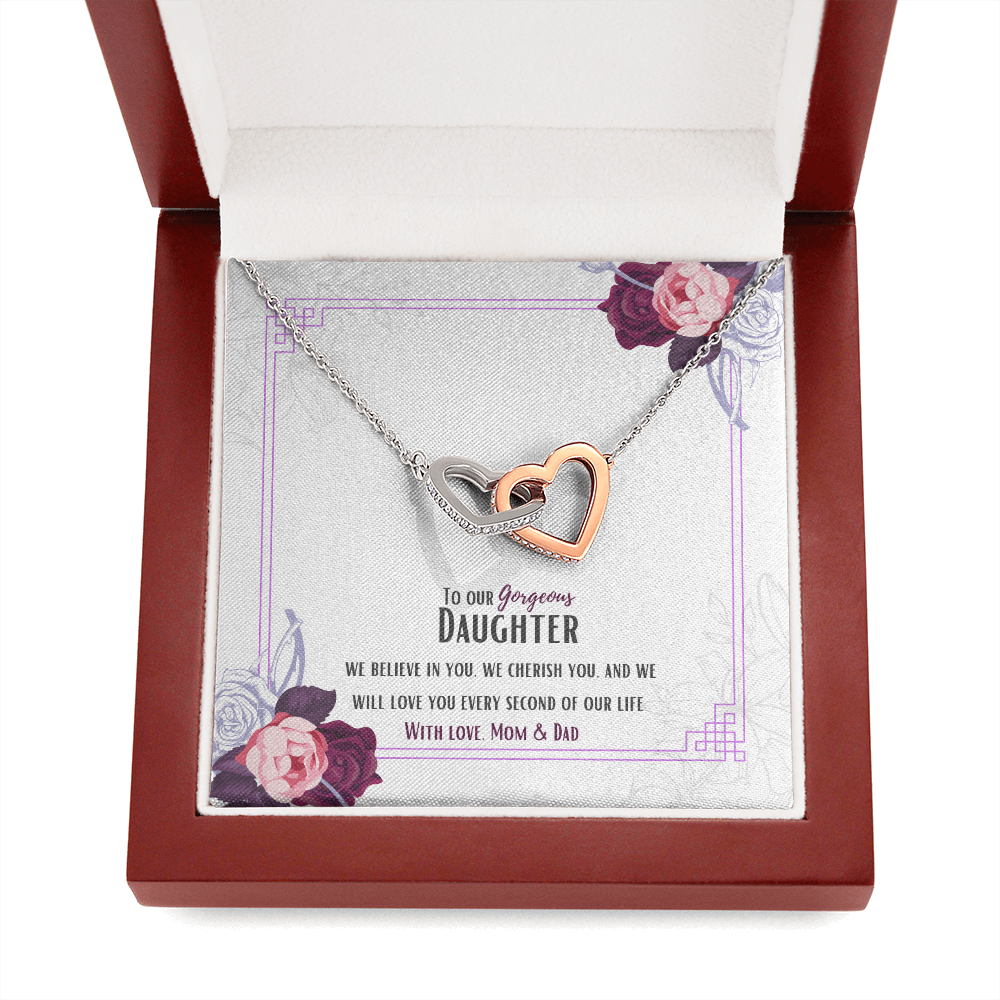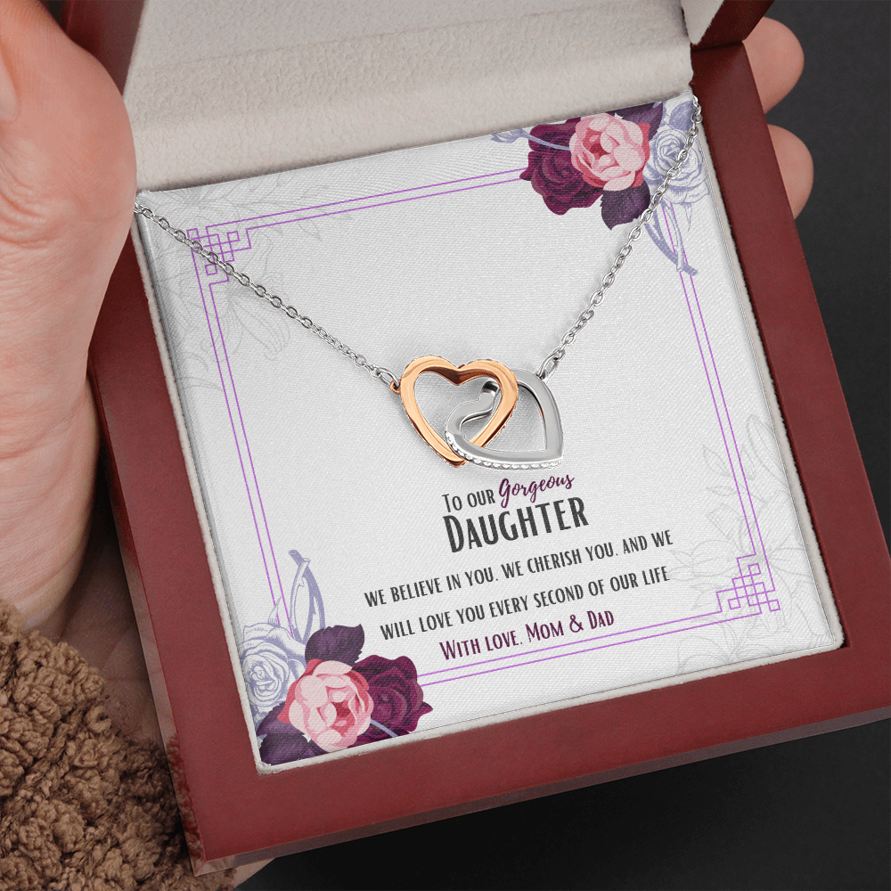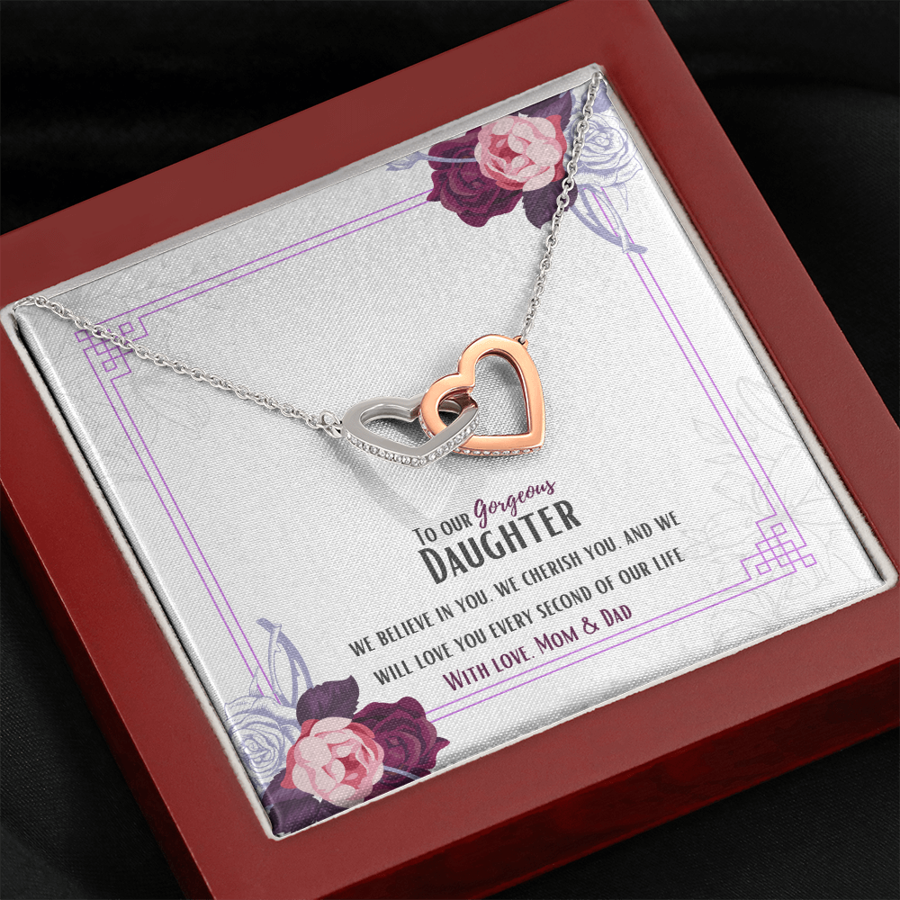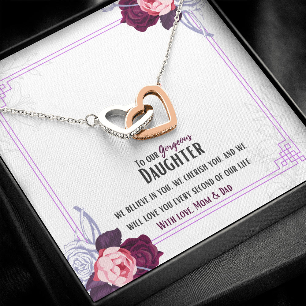 Two hearts embellished with Cubic Zirconia stones, interlocked together as a symbol of never-ending love. Made with high quality polished surgical steel. Cable chain measures 18 inches with a 4 inch extension, and fastens with a lobster clasp.