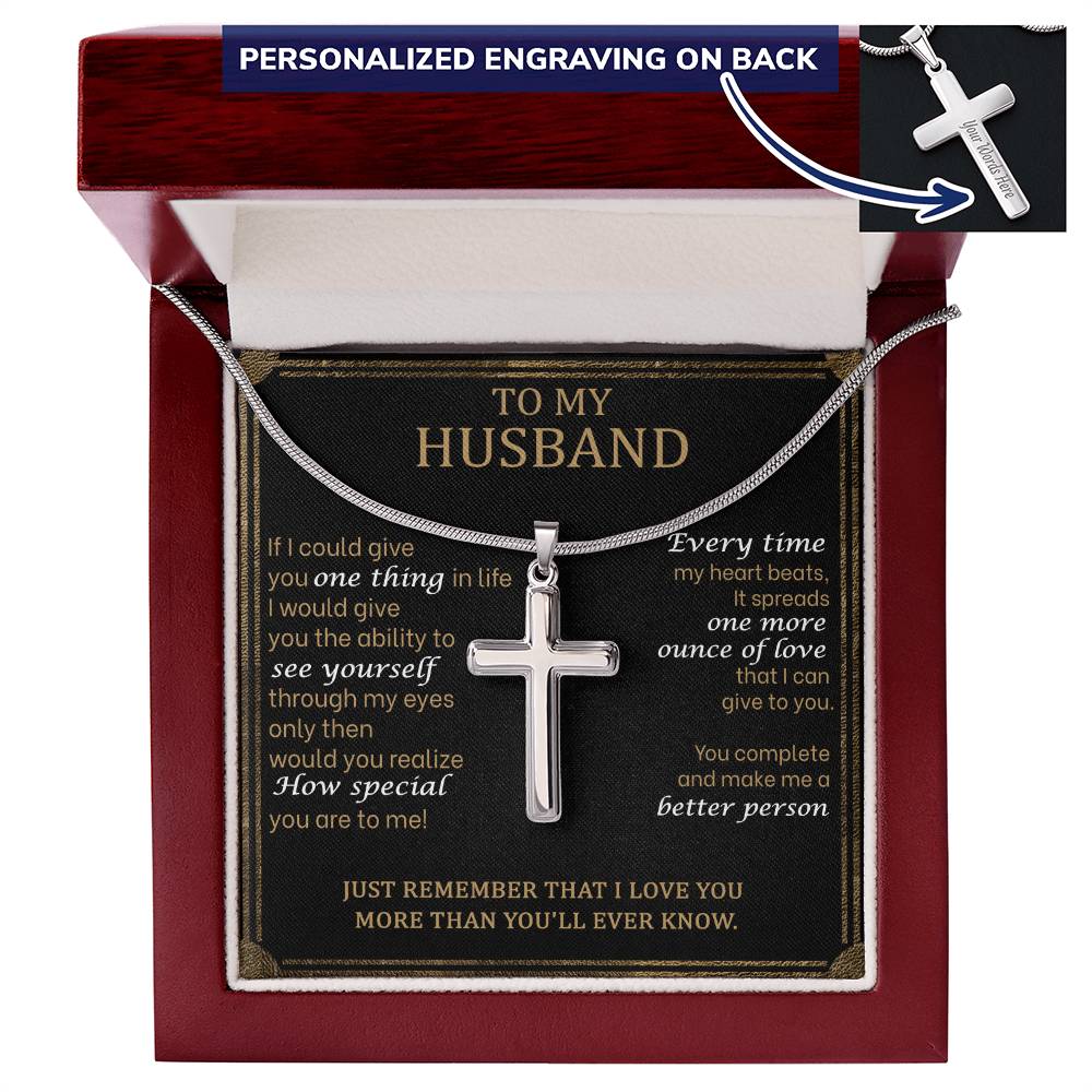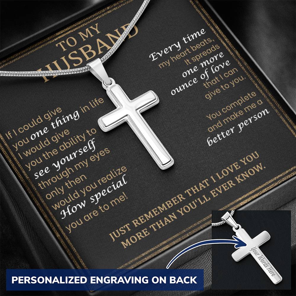 Show your beloved husband how much he means to you with this Personalized Cross Necklace for Husband. This custom engraved cross necklace makes the perfect anniversary gift or romantic present for the faithful man in your life.