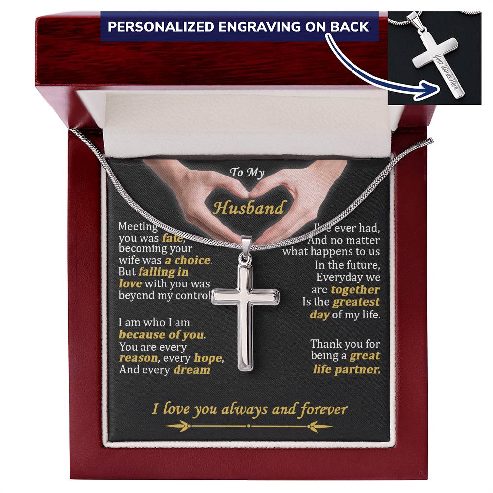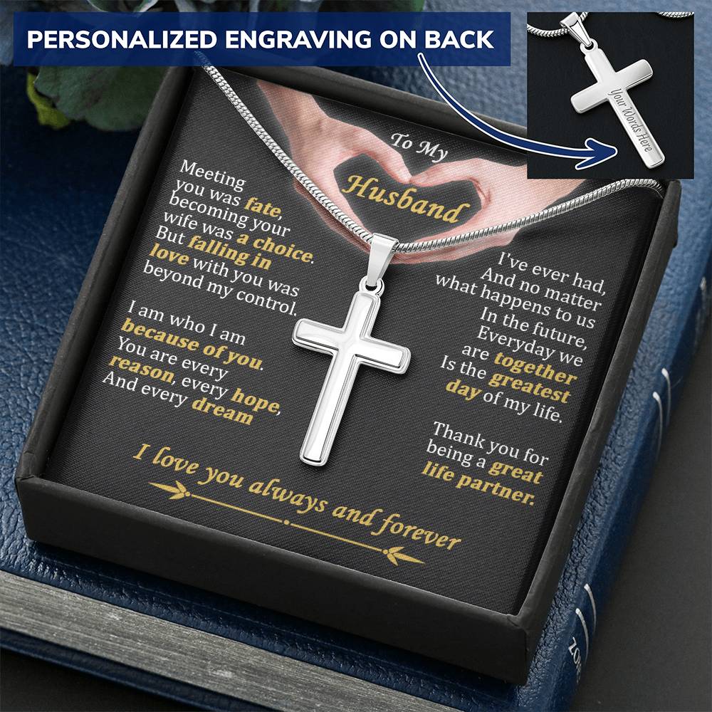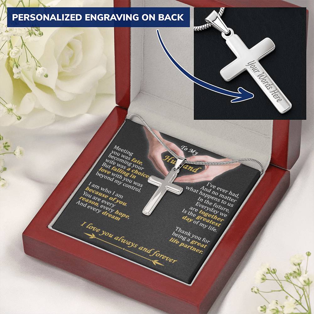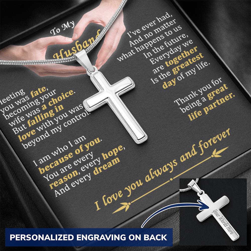 Show your beloved husband how much he means to you with this Personalized Cross Necklace for Husband. This custom engraved cross necklace makes the perfect anniversary gift or romantic present for the faithful man in your life.