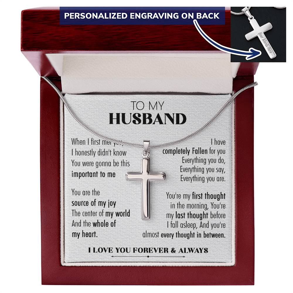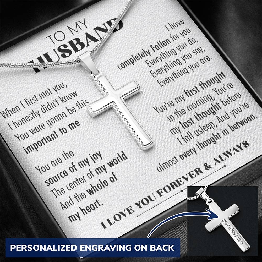 Show your beloved husband how much he means to you with this Personalized Cross Necklace for Husband. This custom engraved cross necklace makes the perfect anniversary gift or romantic present for the faithful man in your life.