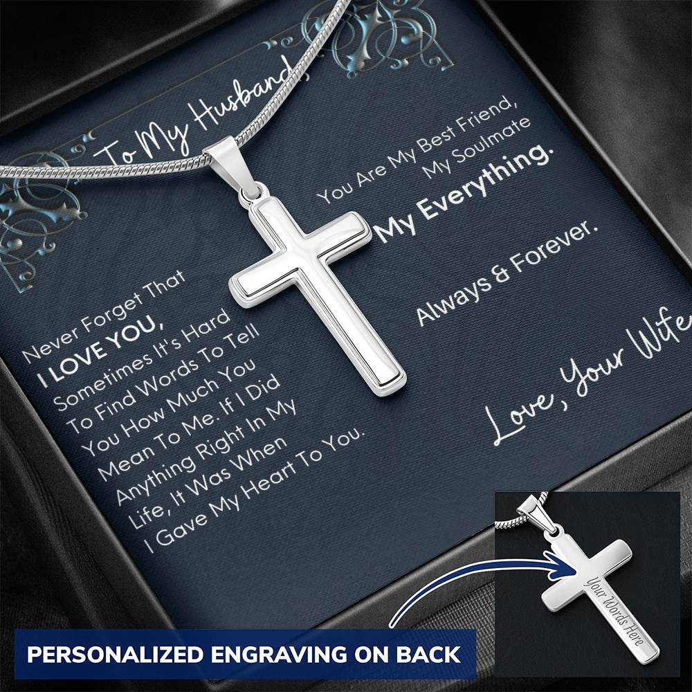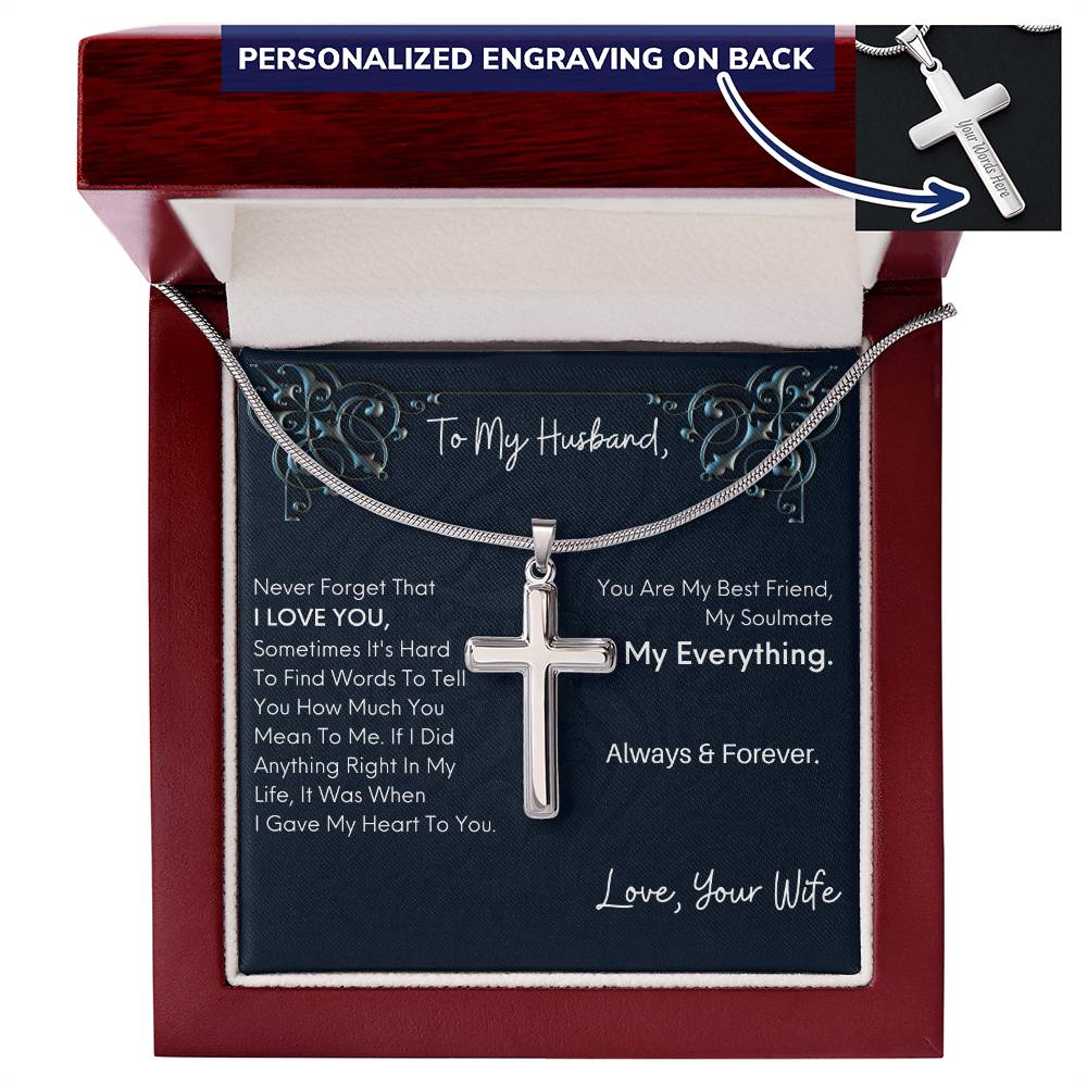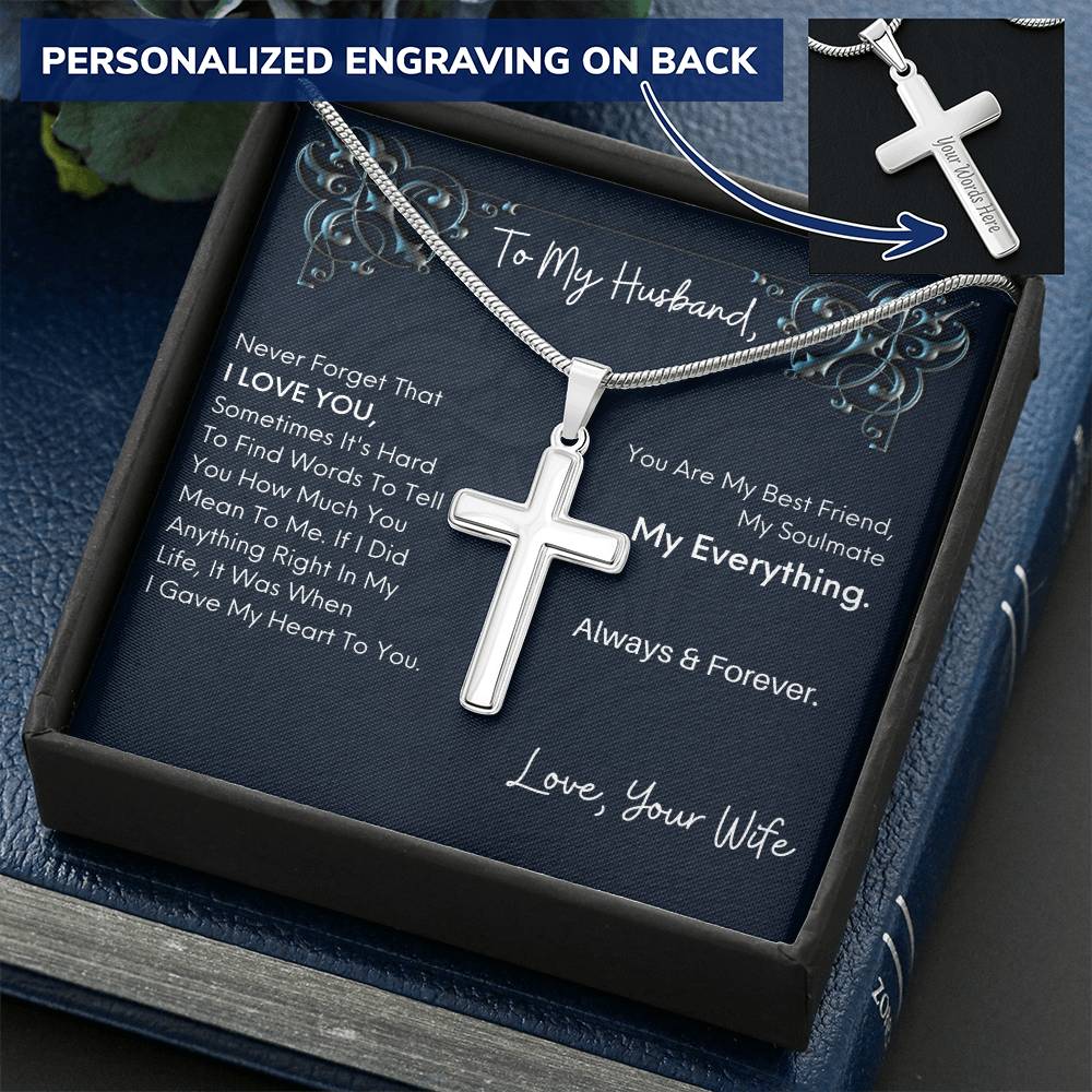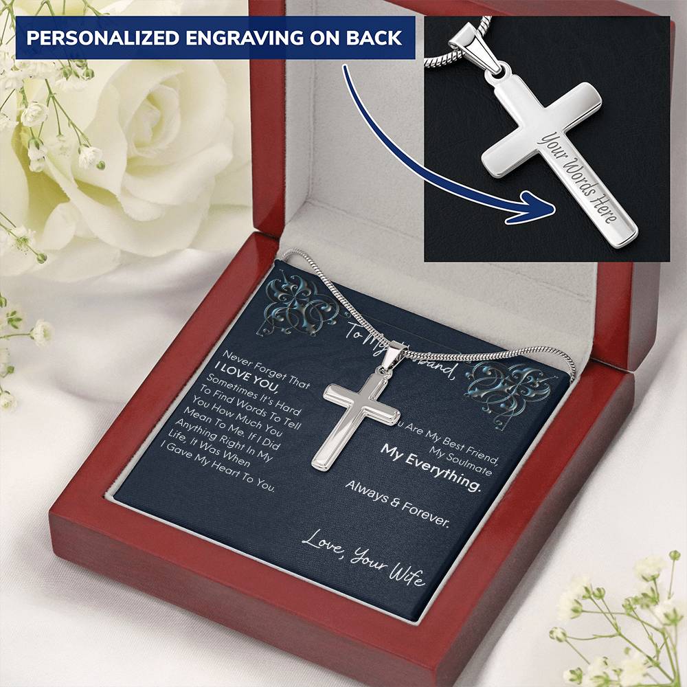 Show your beloved husband how much he means to you with this Personalized Cross Necklace for Husband. This custom engraved cross necklace makes the perfect anniversary gift or romantic present for the faithful man in your life.