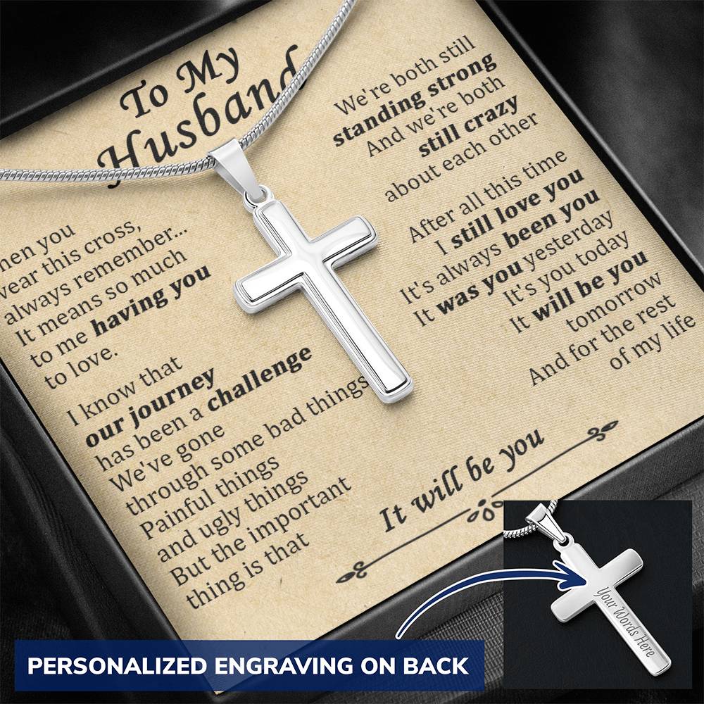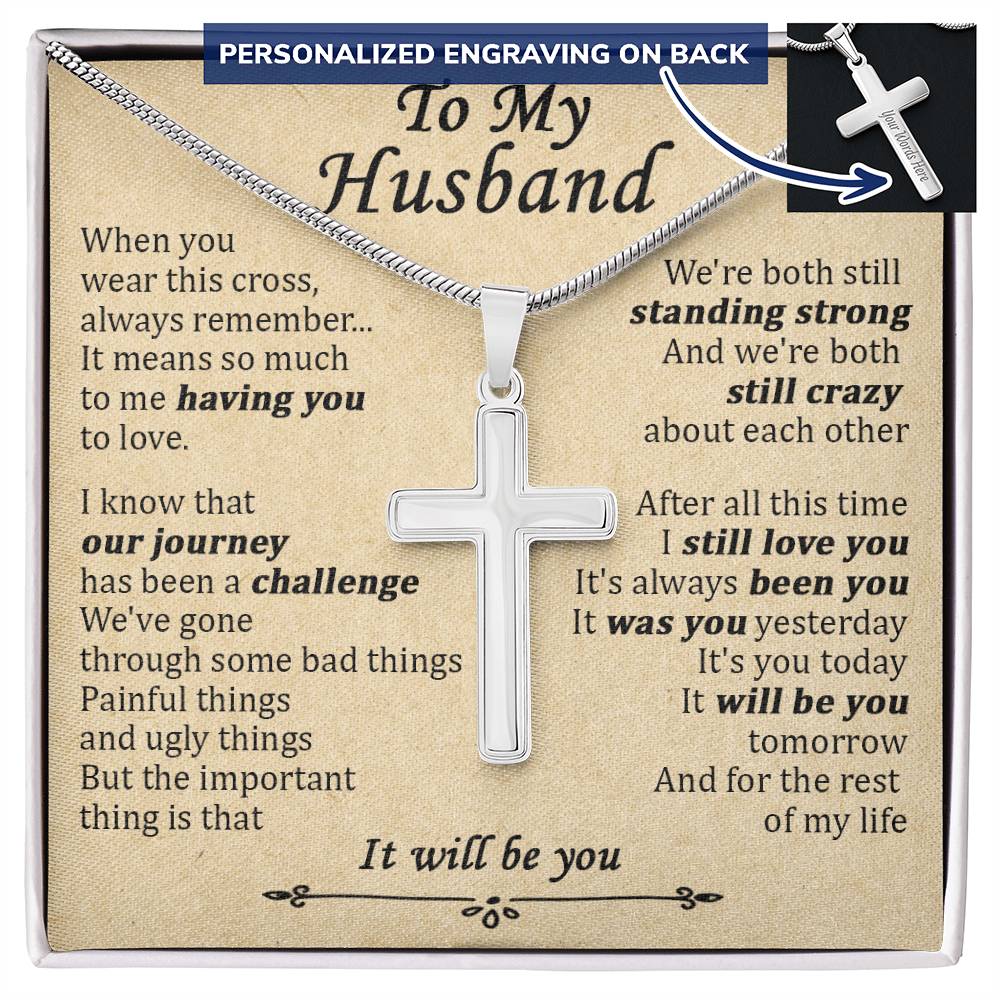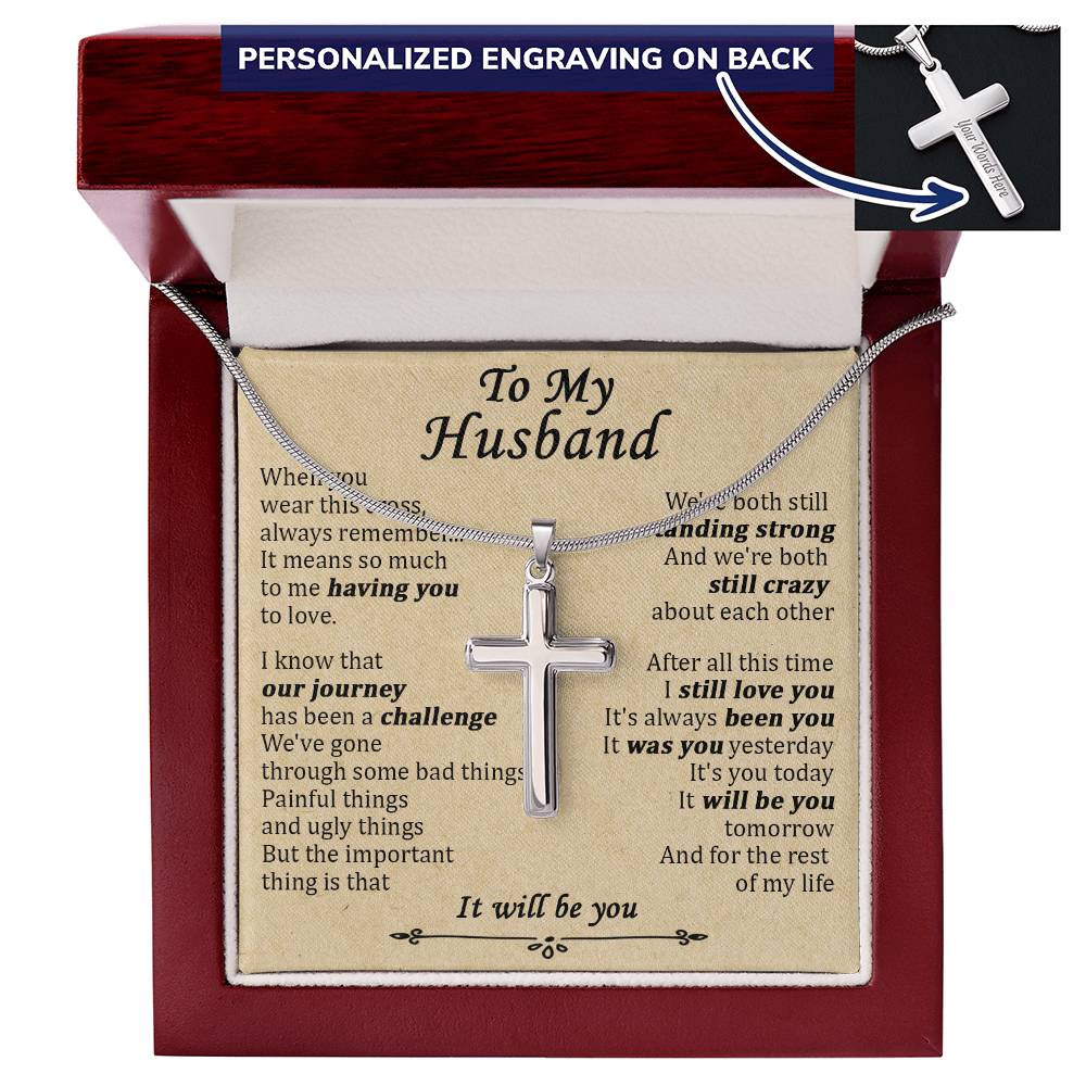Show your beloved husband how much he means to you with this Personalized Cross Necklace for Husband. This custom engraved cross necklace makes the perfect anniversary gift or romantic present for the faithful man in your life.
