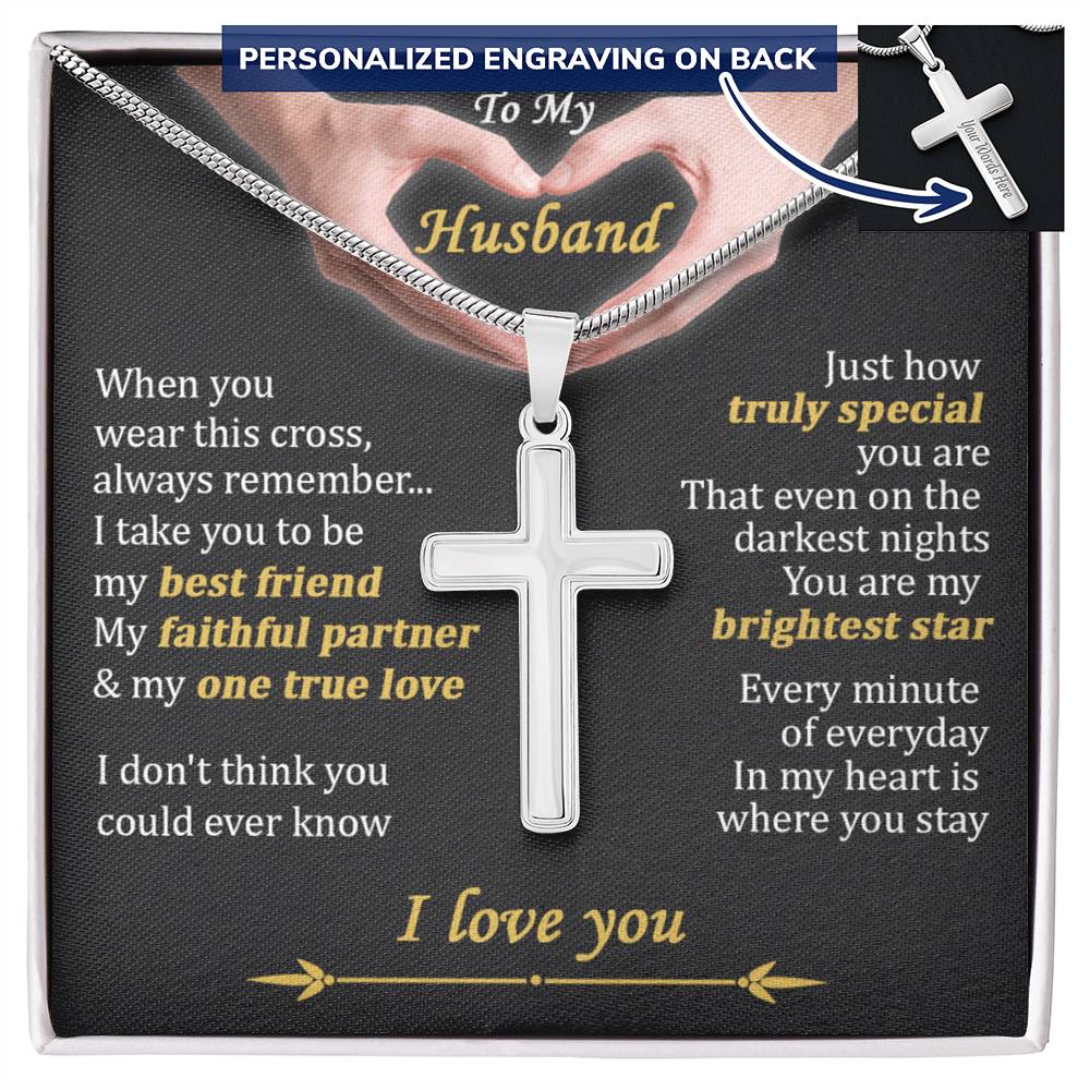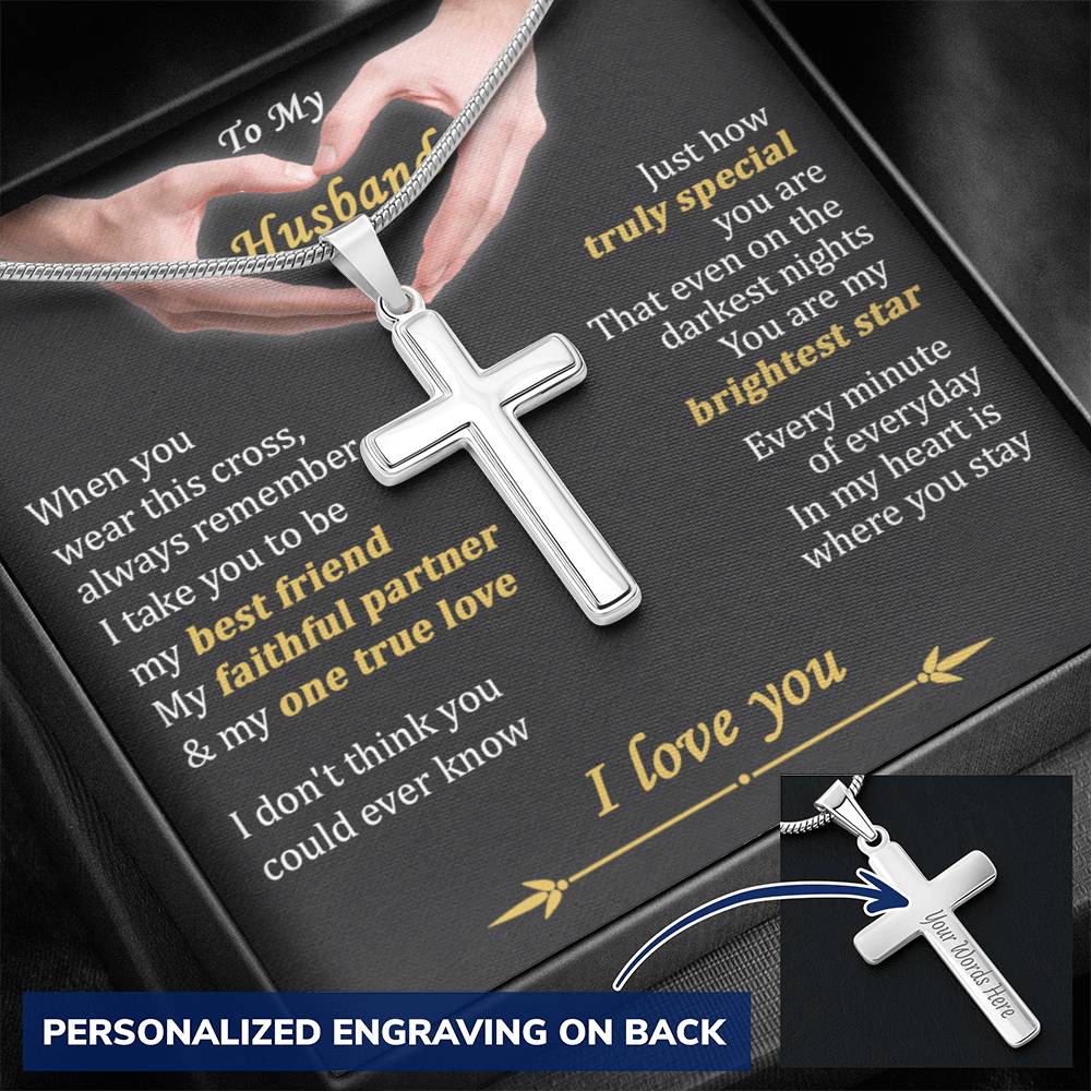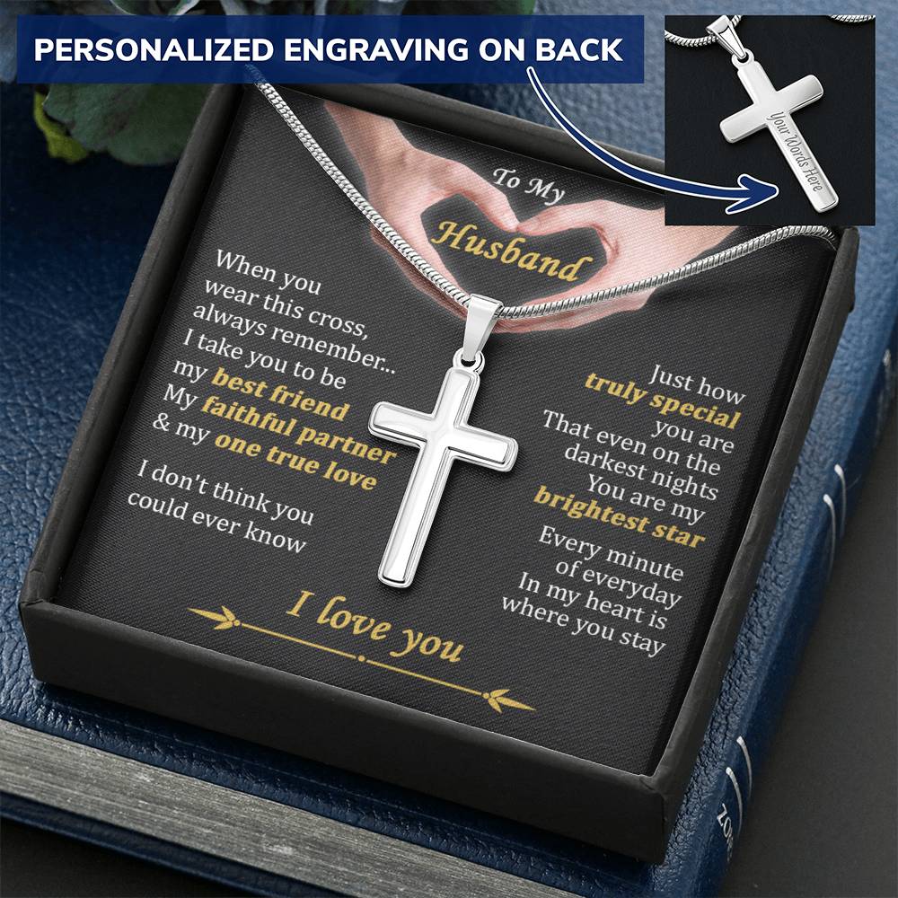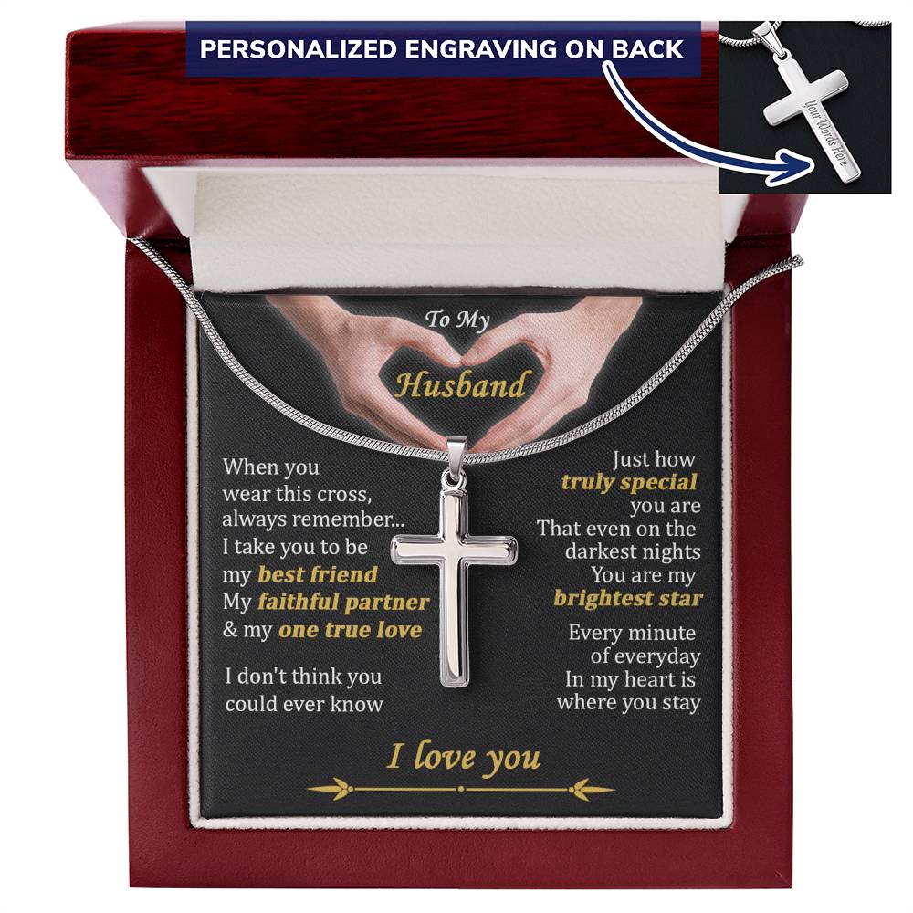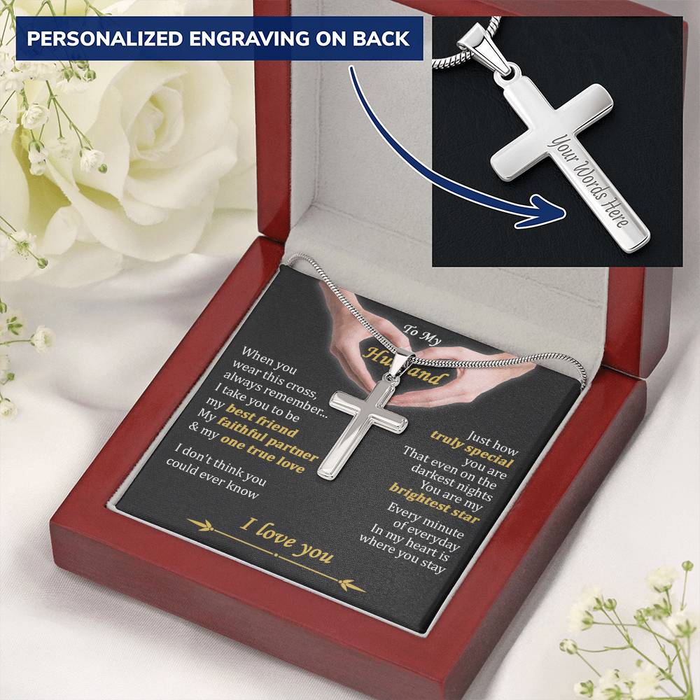 Show your beloved husband how much he means to you with this Personalized Cross Necklace for Husband. This custom engraved cross necklace makes the perfect anniversary gift or romantic present for the faithful man in your life.