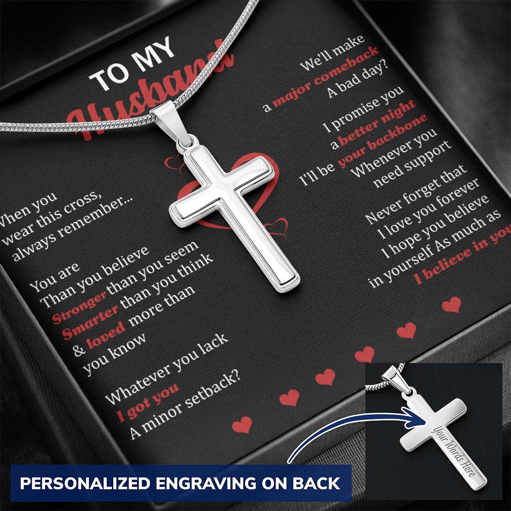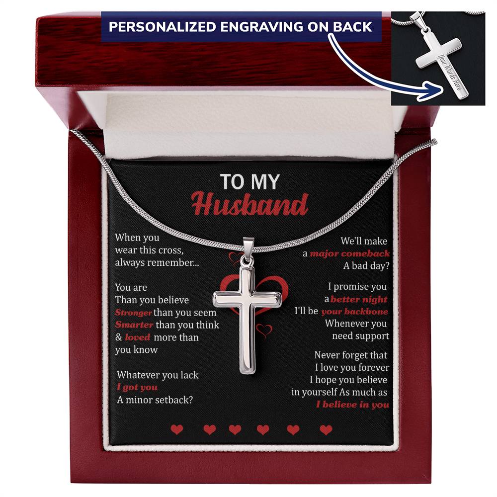Show your beloved husband how much he means to you with this Personalized Cross Necklace for Husband. This custom engraved cross necklace makes the perfect anniversary gift or romantic present for the faithful man in your life.