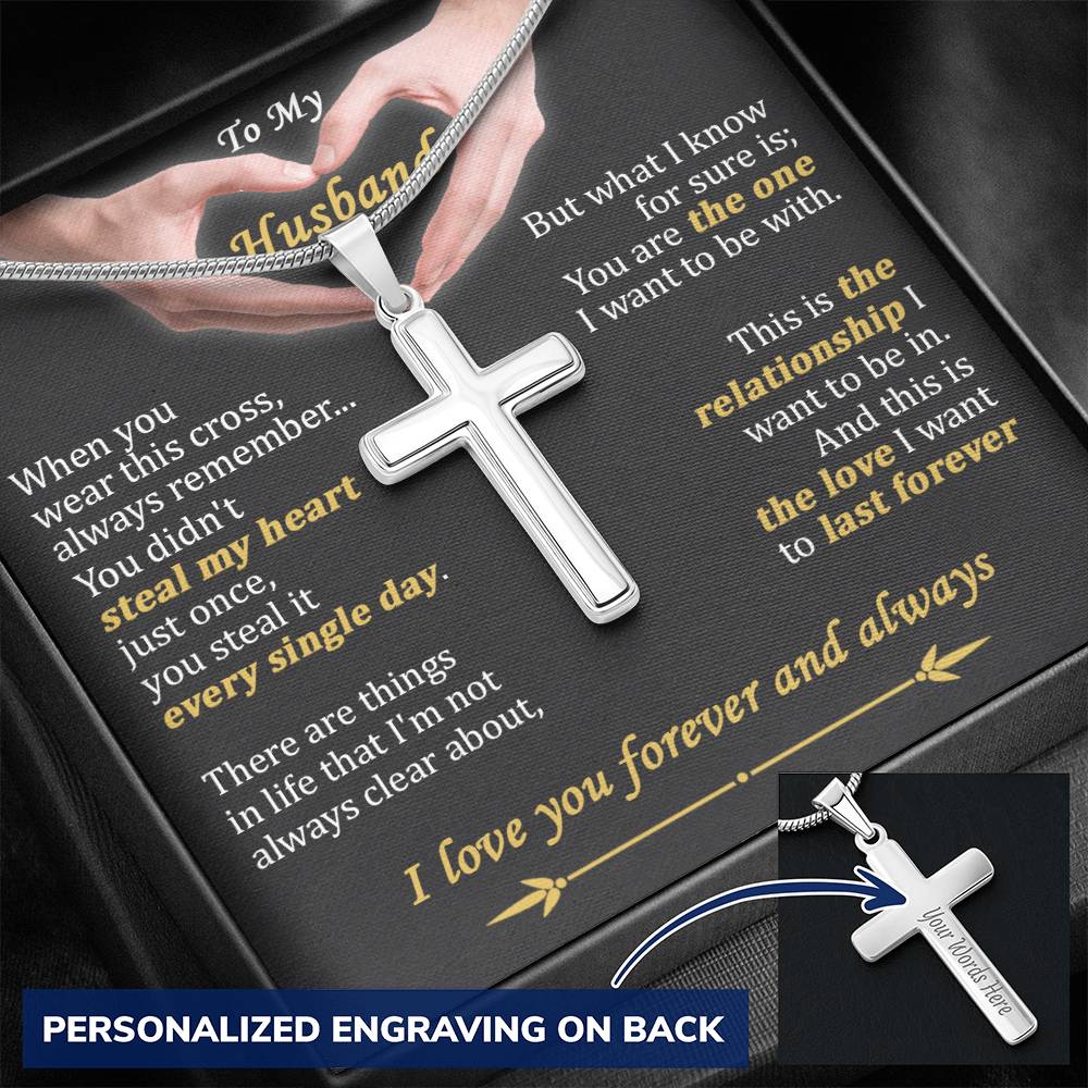 Show your beloved husband how much he means to you with this Personalized Cross Necklace for Husband. This custom engraved cross necklace makes the perfect anniversary gift or romantic present for the faithful man in your life.