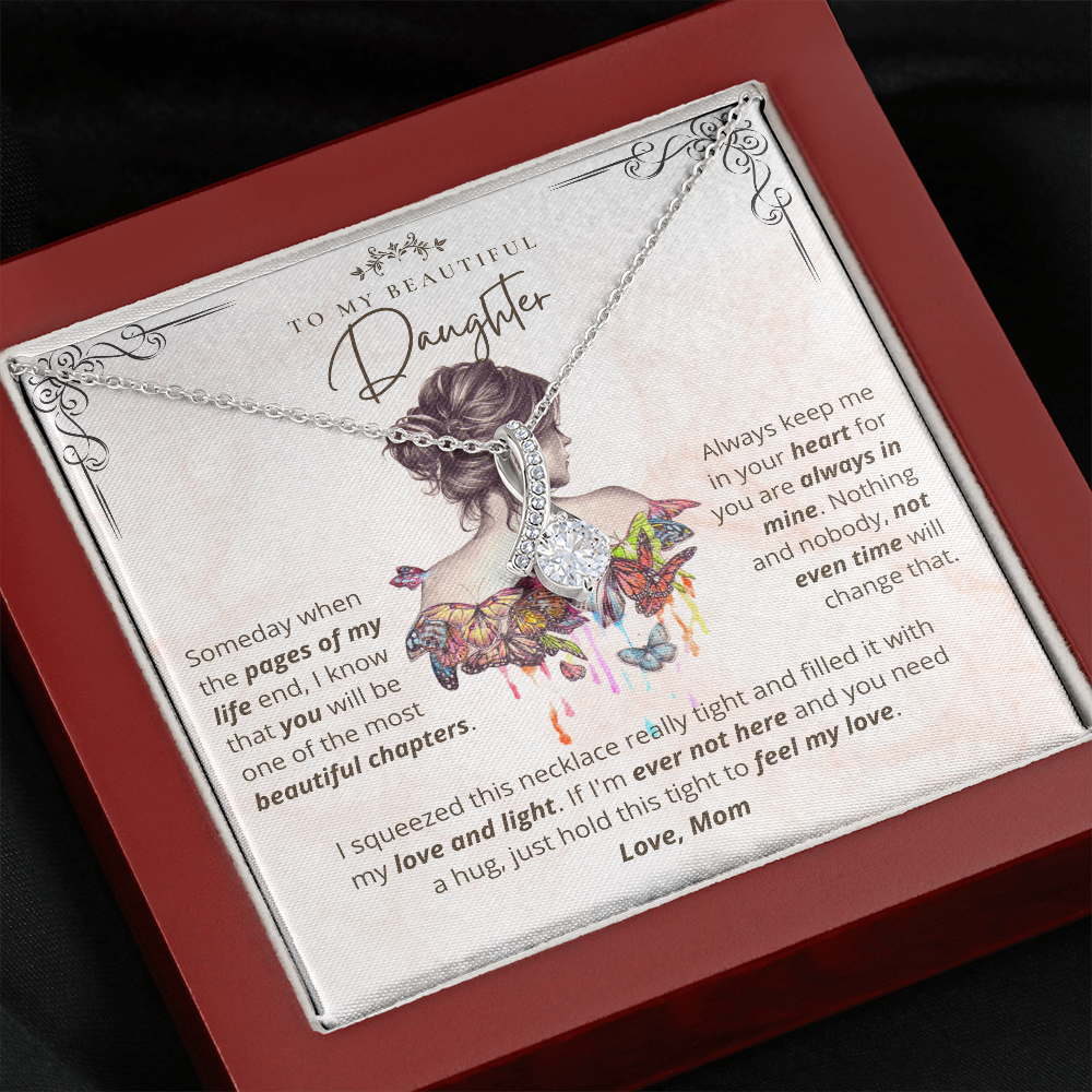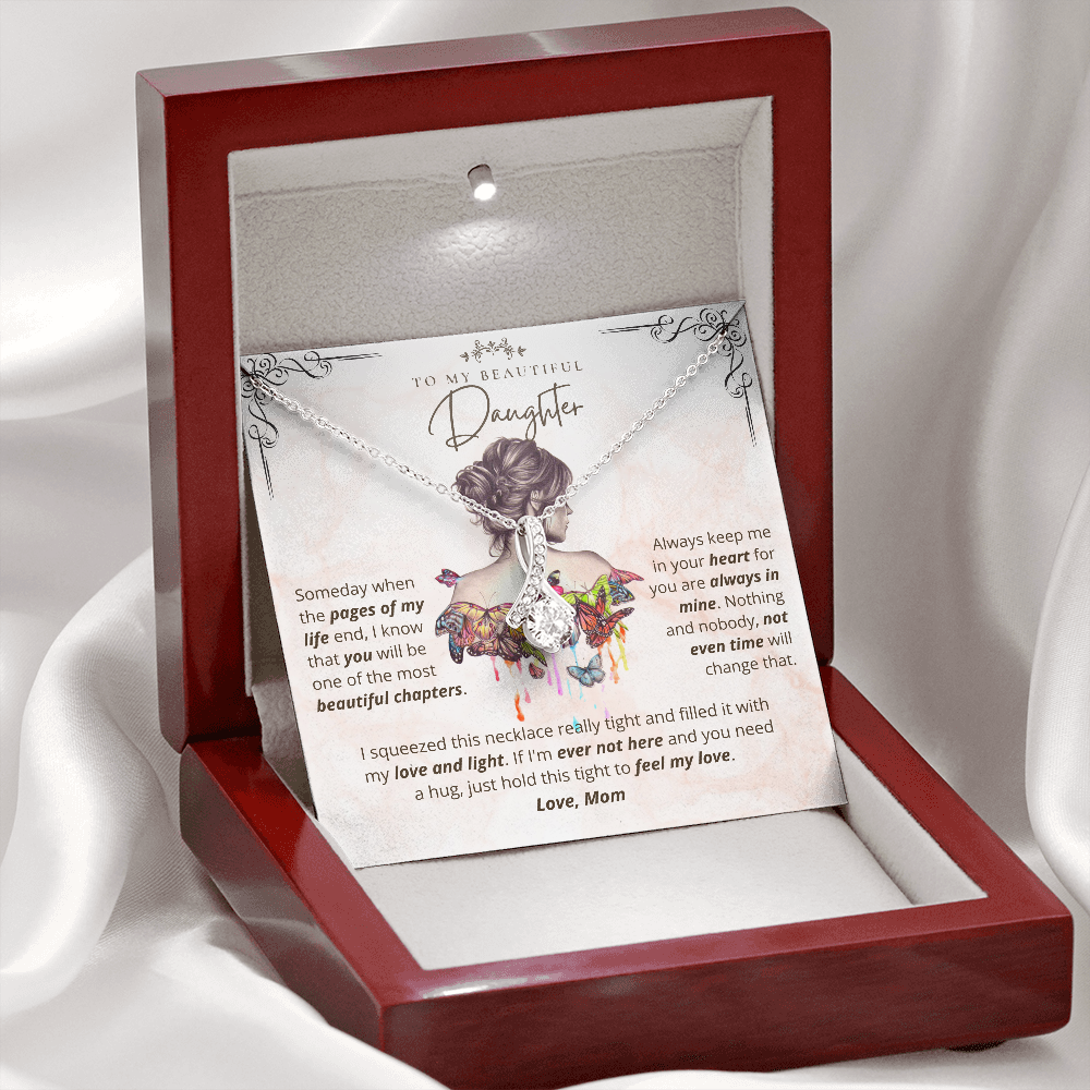 "Someday when the pages of my life end, I know that you will be one of the most beautiful chapters. Always keep me in your heart for you are always in mine. Nothing and nobody, not even time will change that. I squeezed this necklace really tight and filled it with my love and light. If I'm ever not here and you need a hug, just hold this tight to feel my love."