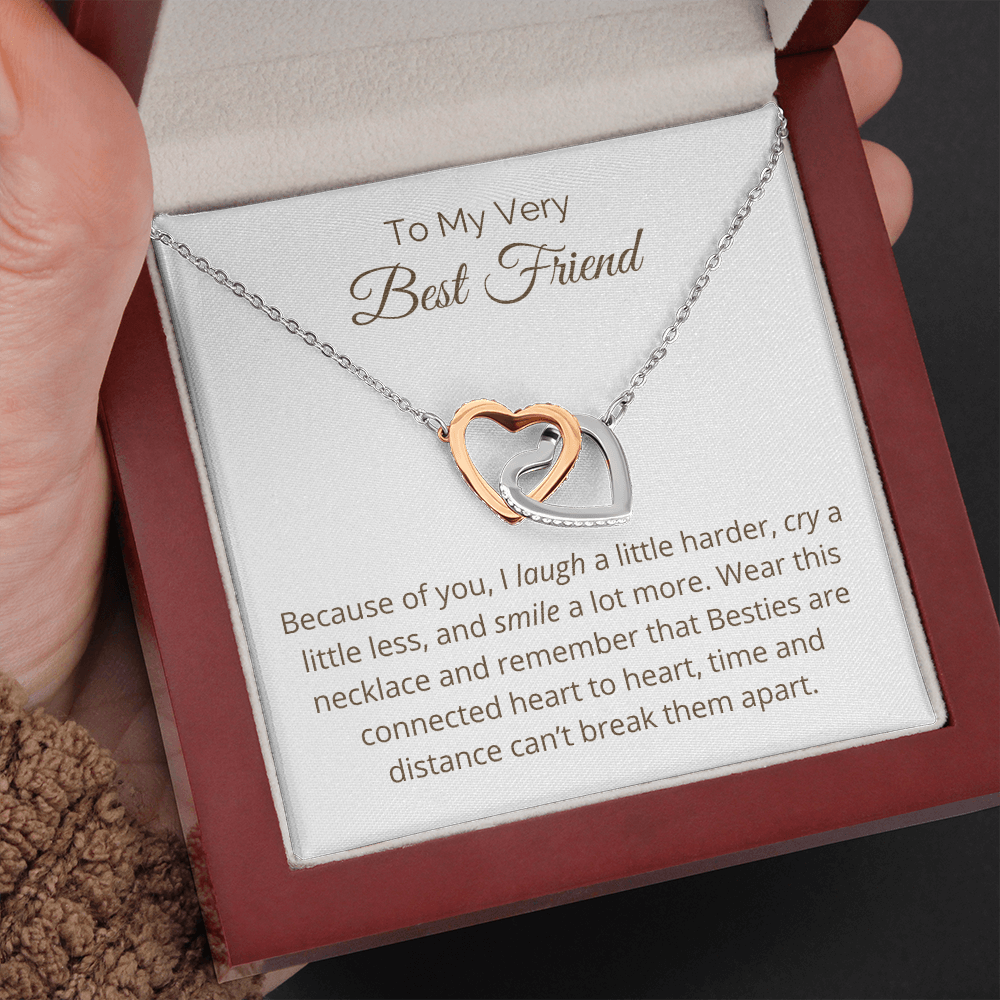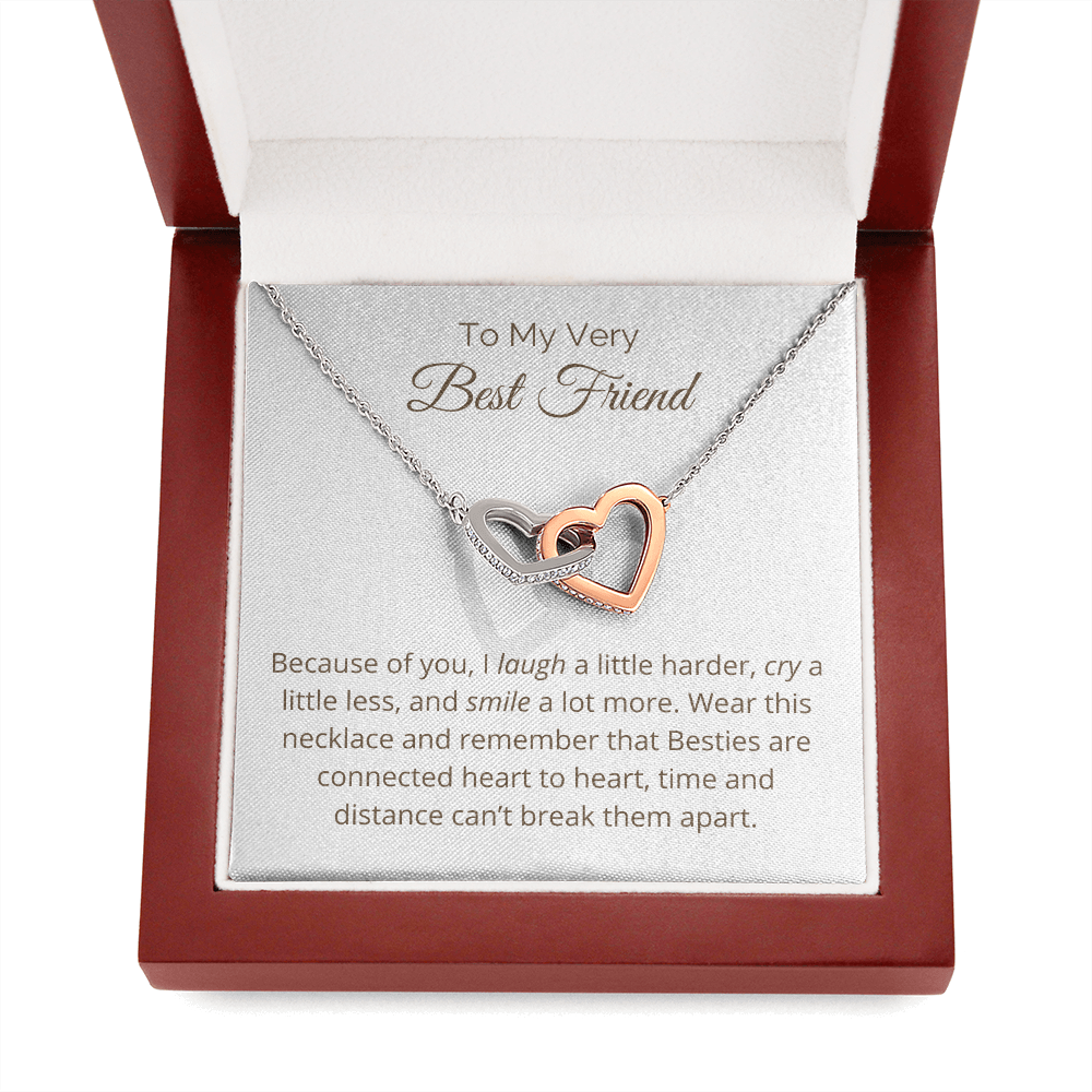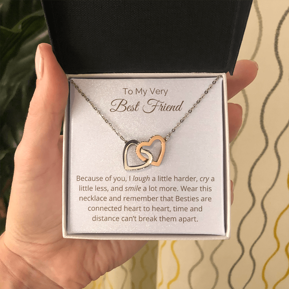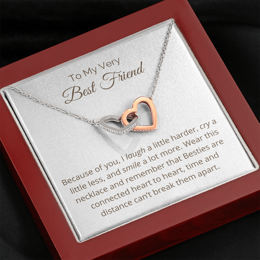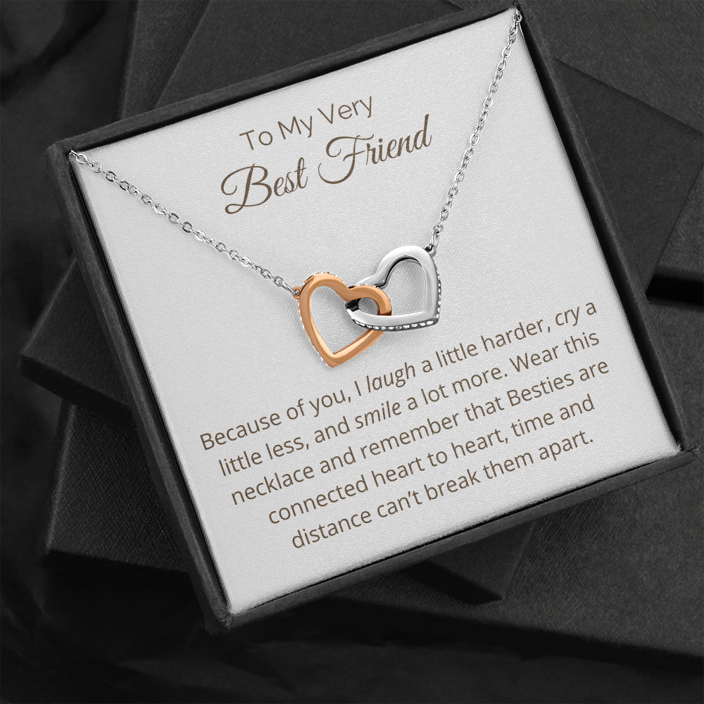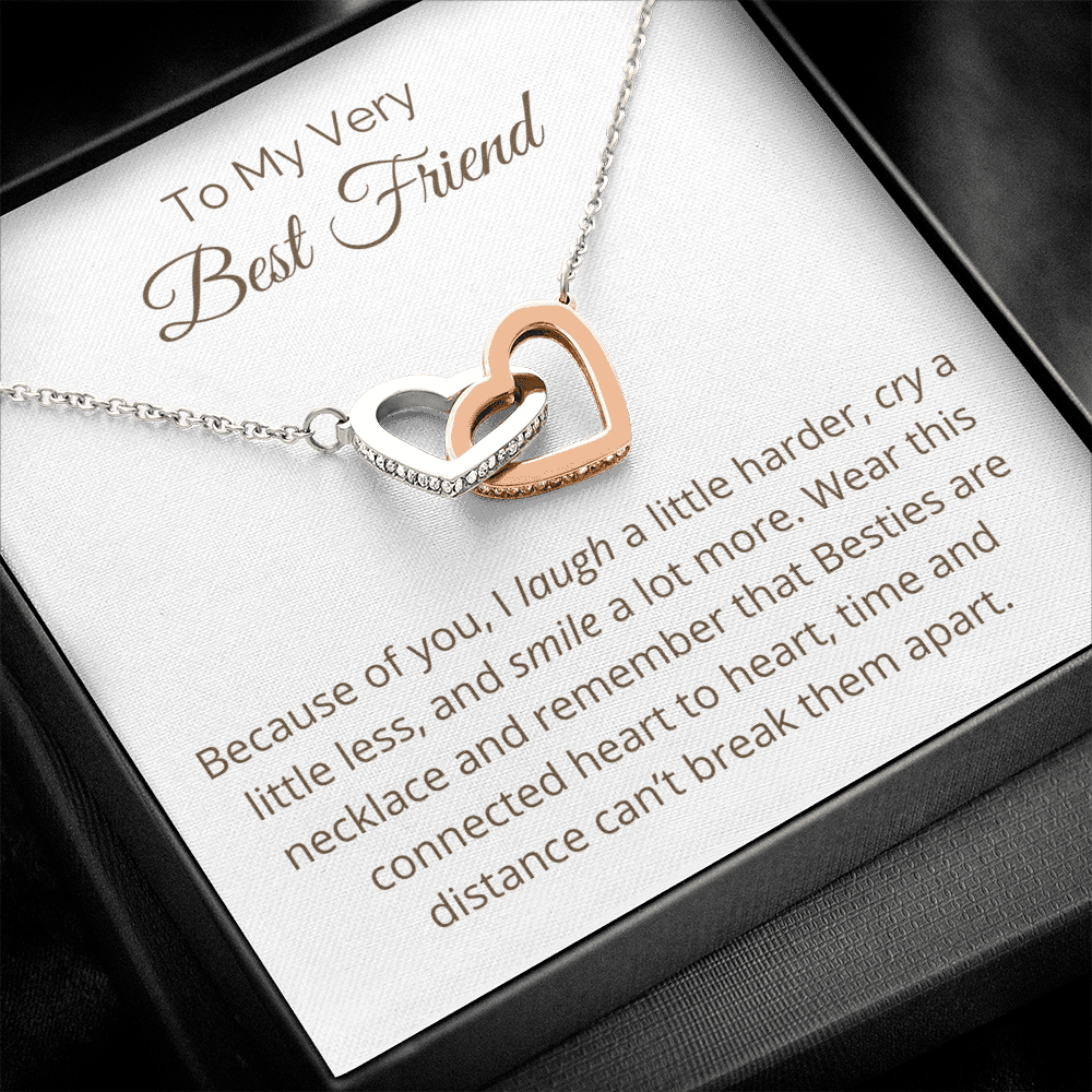 Two hearts embellished with Cubic Zirconia stones, interlocked together as a symbol of never-ending friendship. Made with high quality polished surgical steel. Cable chain measures 18 inches with a 4 inch extension, and fastens with a lobster clasp.