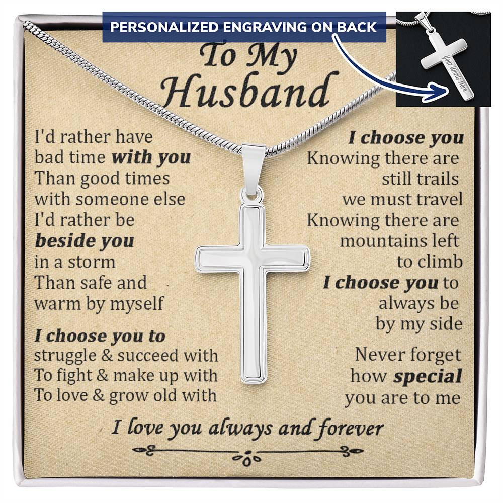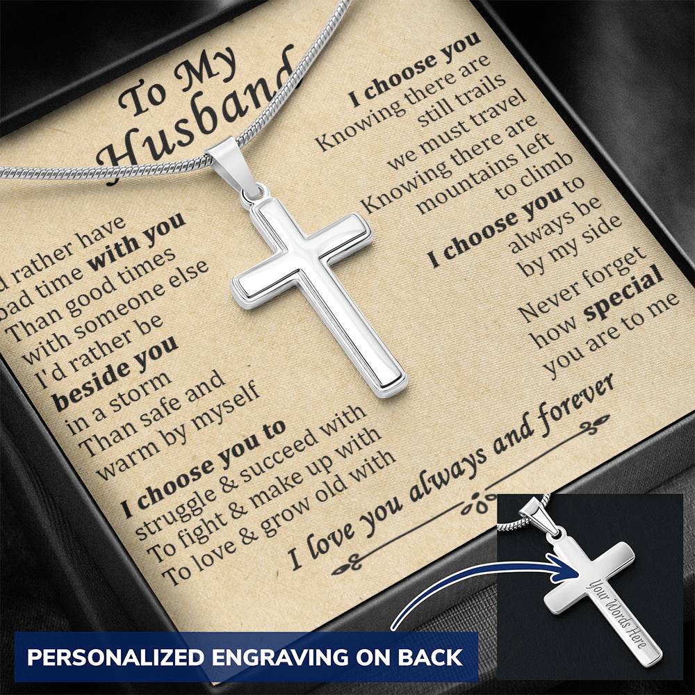 Show your beloved husband how much he means to you with this Personalized Cross Necklace for Husband. This custom engraved cross necklace makes the perfect anniversary gift or romantic present for the faithful man in your life.