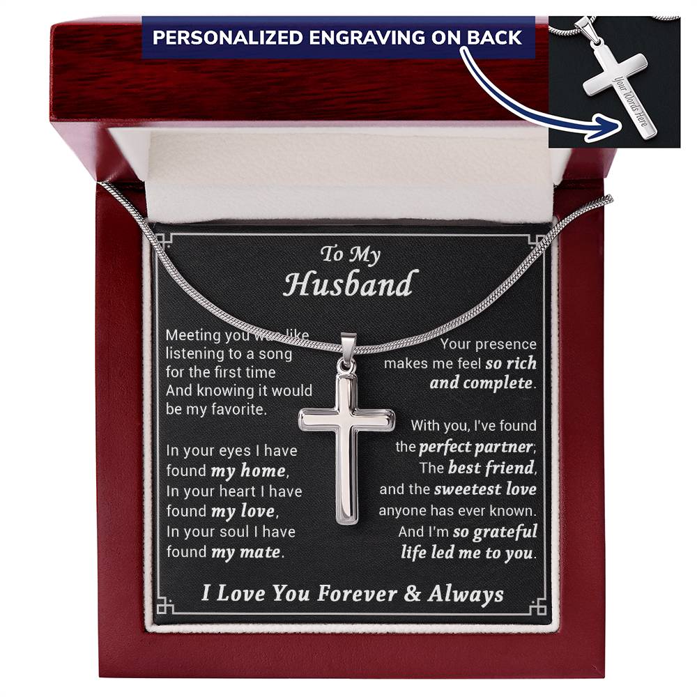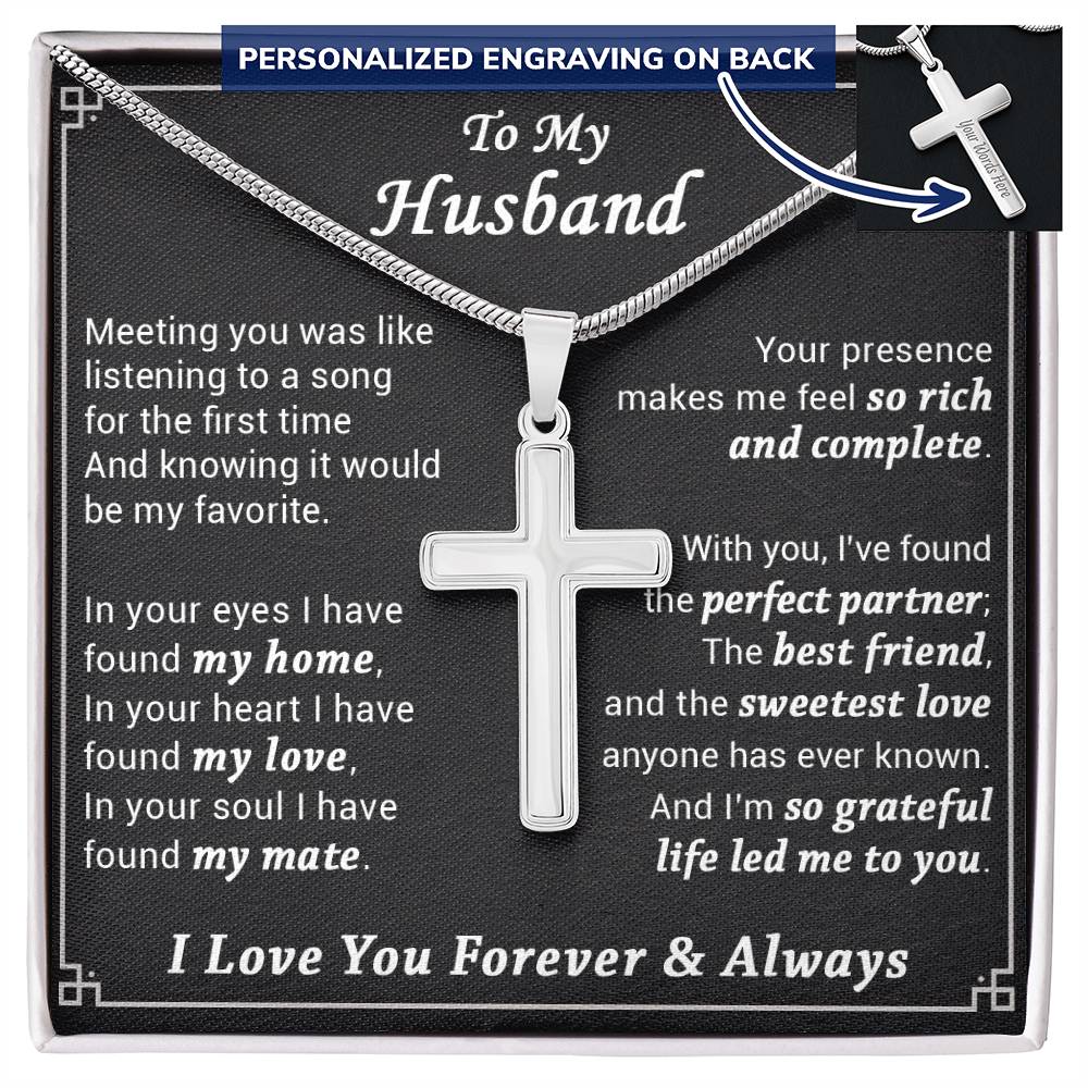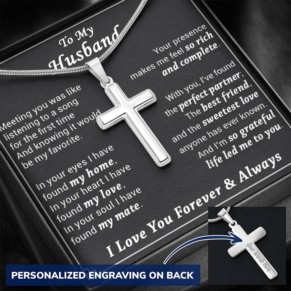 Show your beloved husband how much he means to you with this Personalized Cross Necklace for Husband. This custom engraved cross necklace makes the perfect anniversary gift or romantic present for the faithful man in your life.