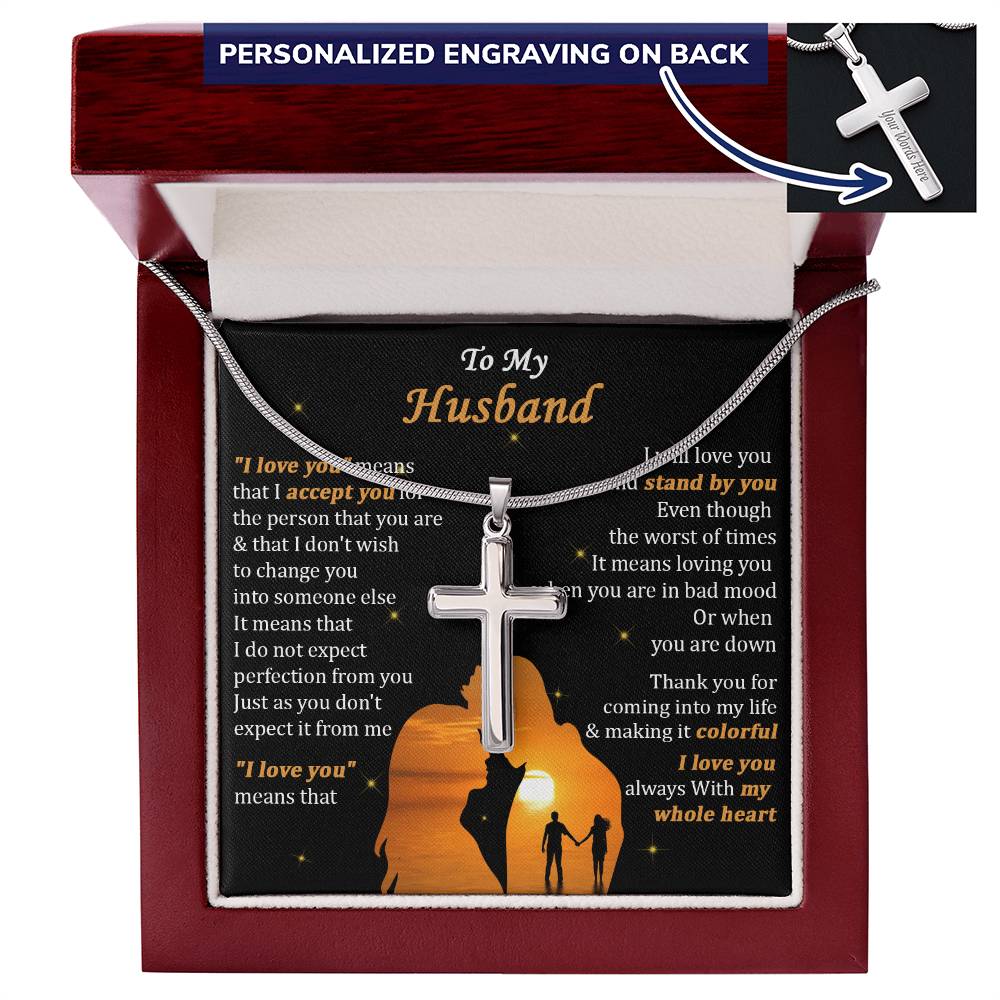 Show your beloved husband how much he means to you with this Personalized Cross Necklace for Husband. This custom engraved cross necklace makes the perfect anniversary gift or romantic present for the faithful man in your life.